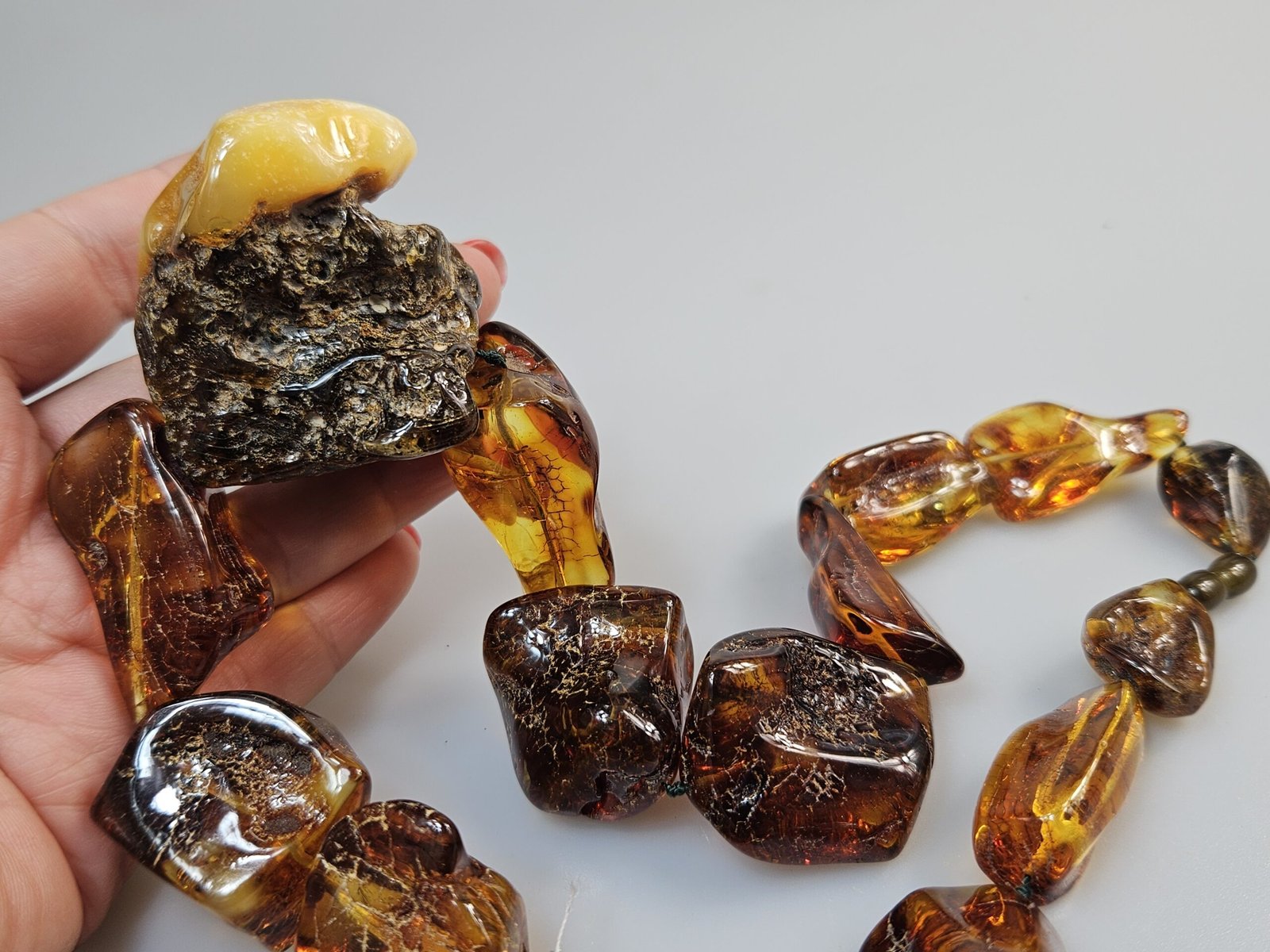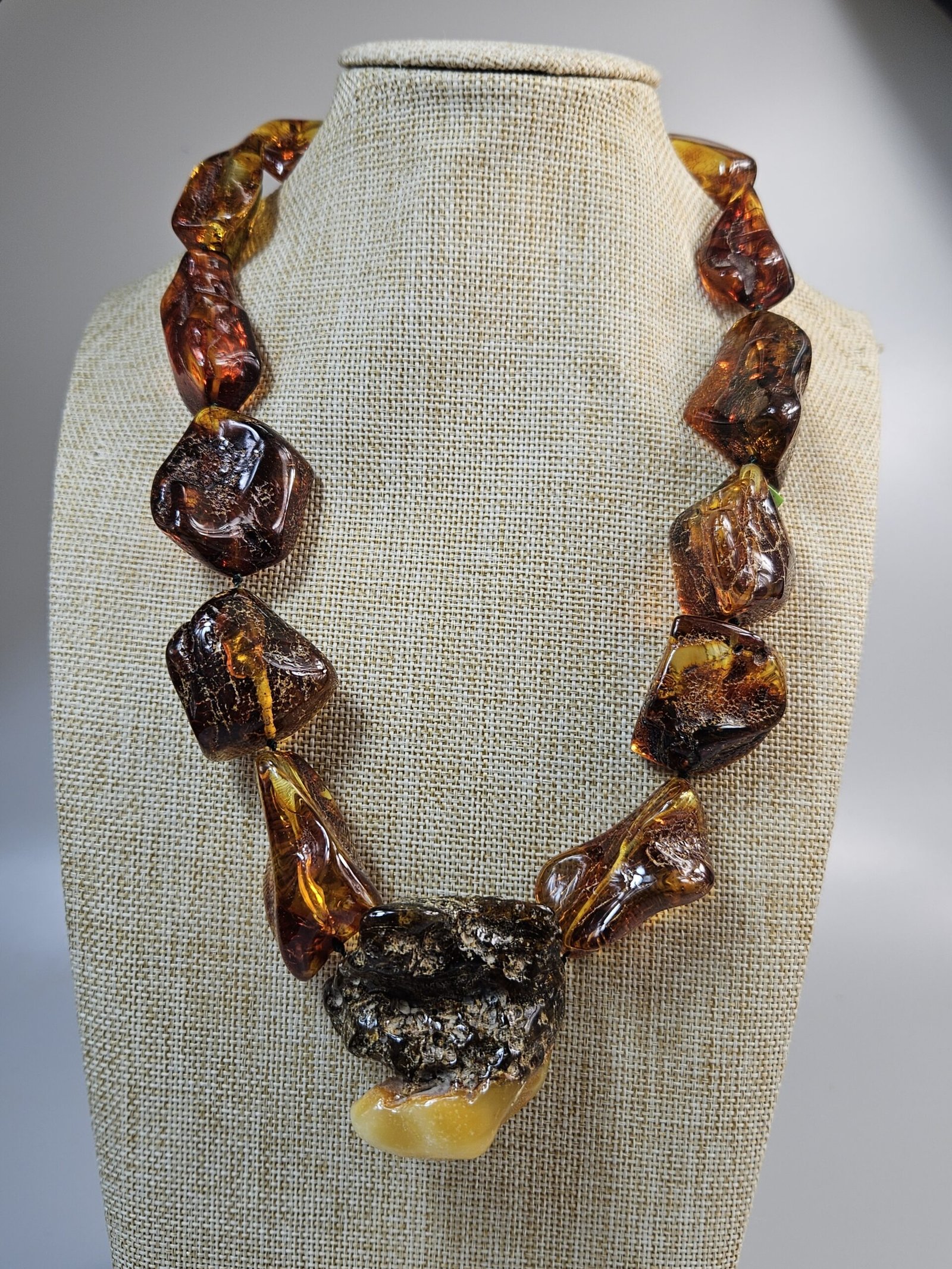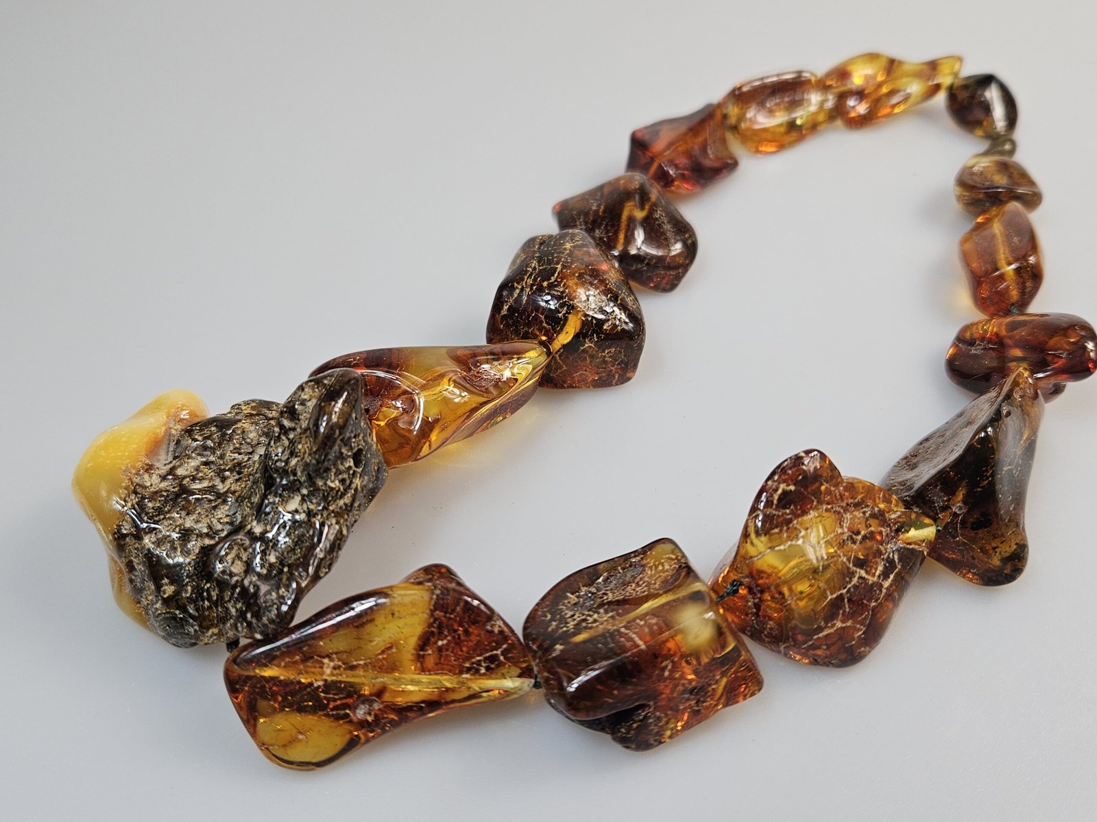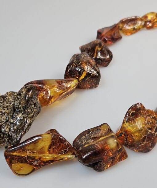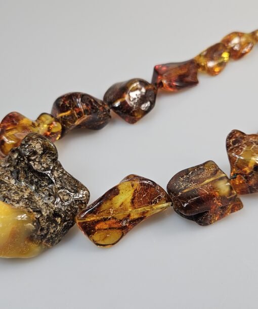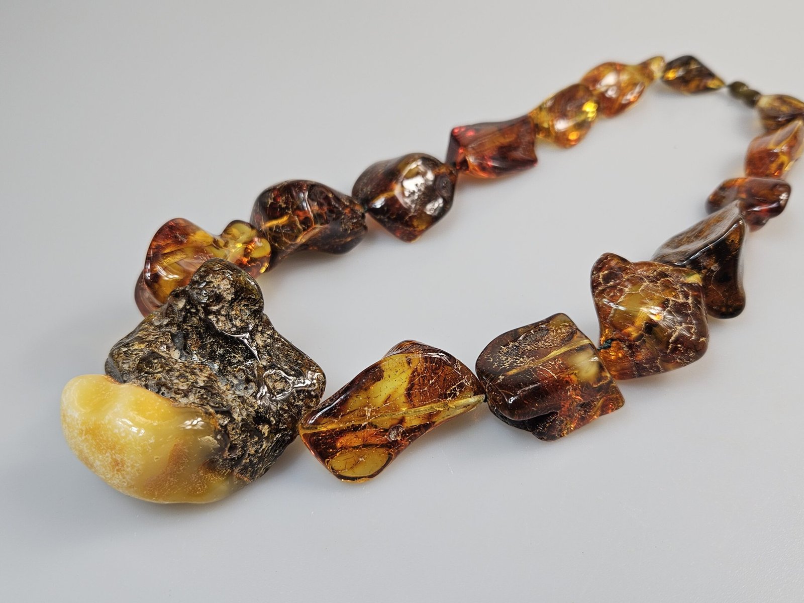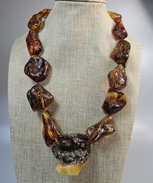 Dvigubi gintariniai karoliai – kolje. Apie 54 cm ilgis, užsukami. Gintarai 2,5-4 cm. Masyvūs gintariniai karoliai margi įspūdingi . Svoris 119 gr.