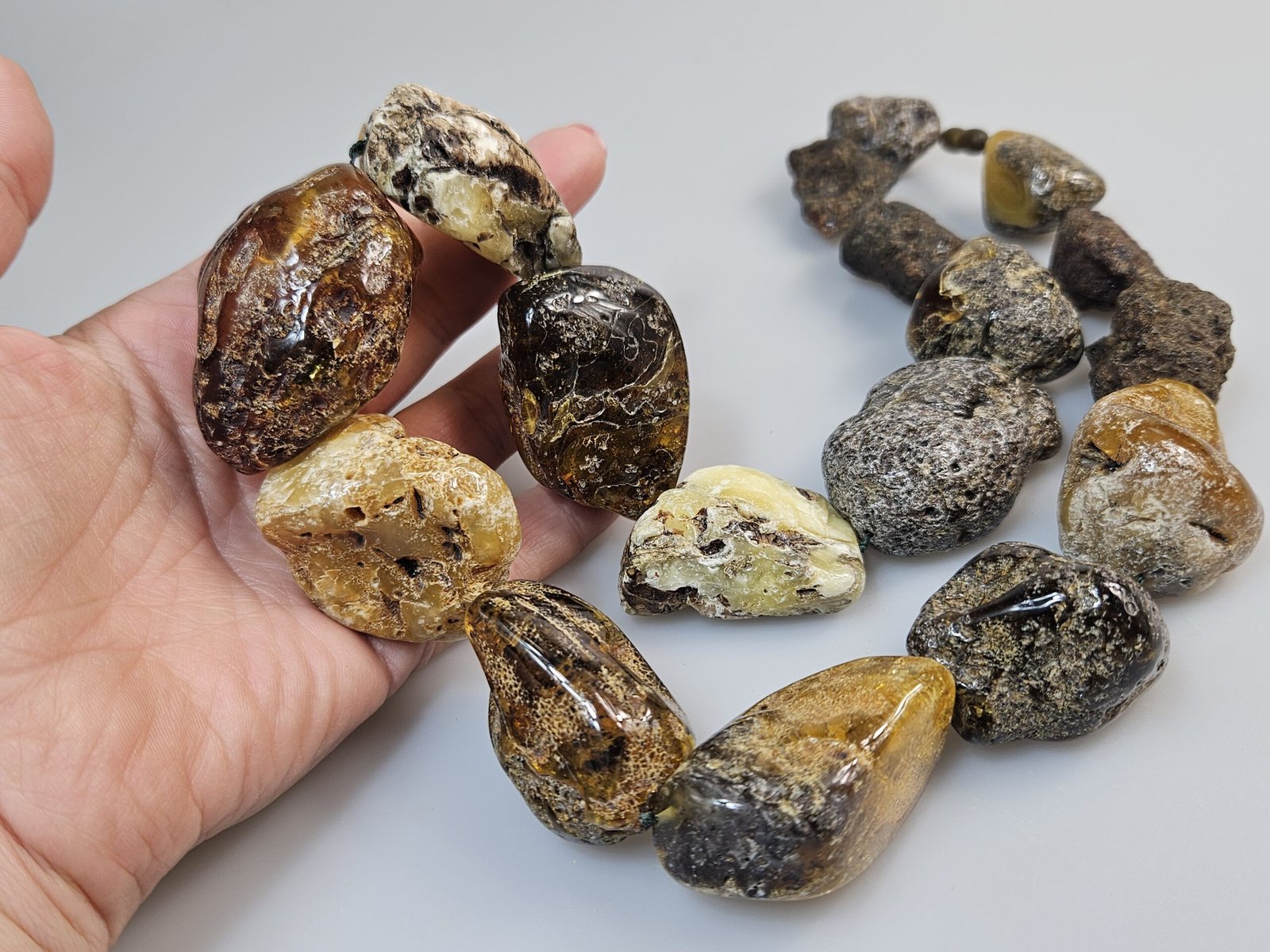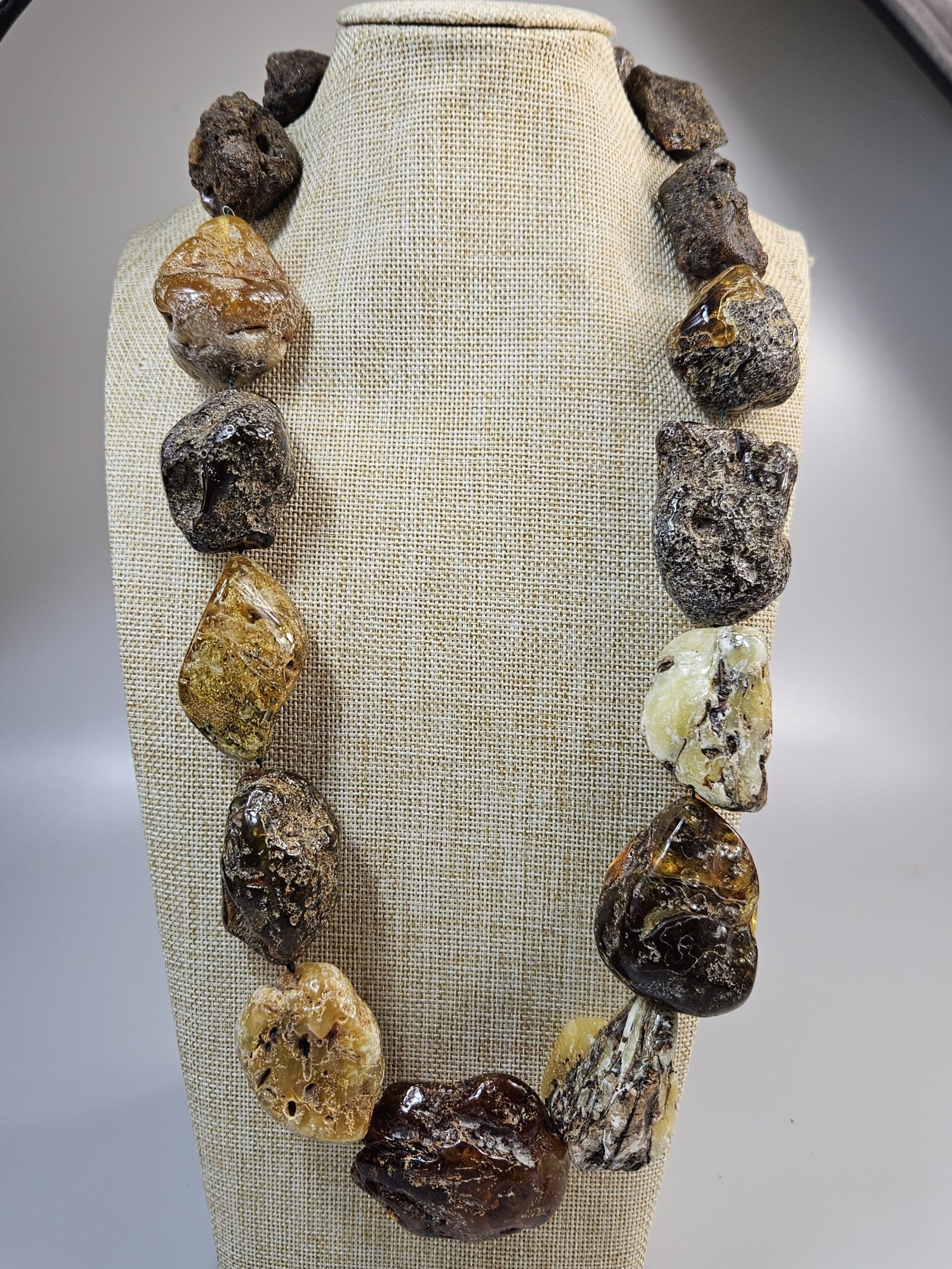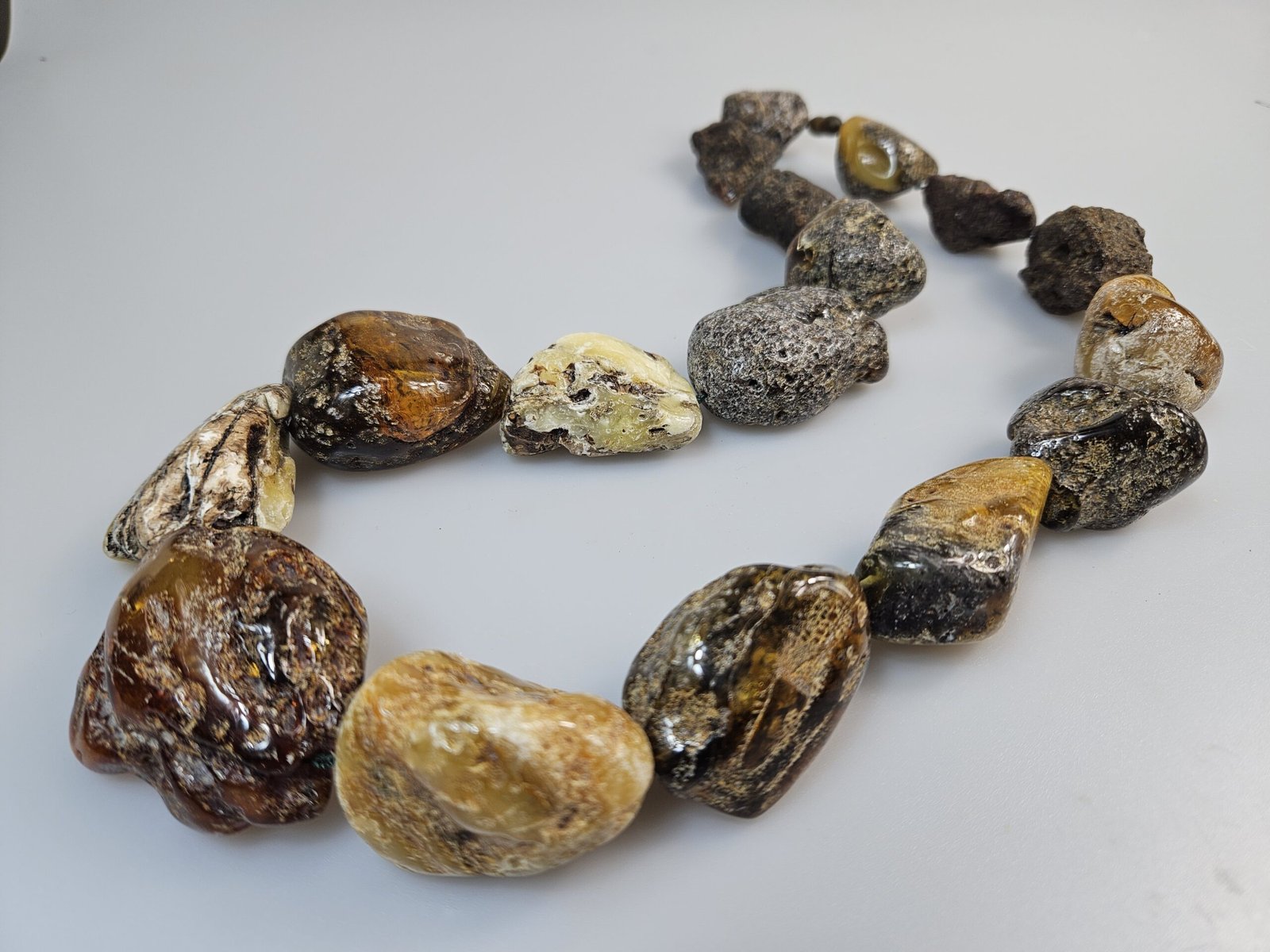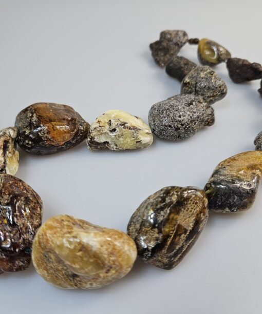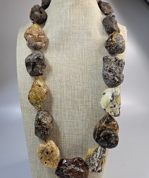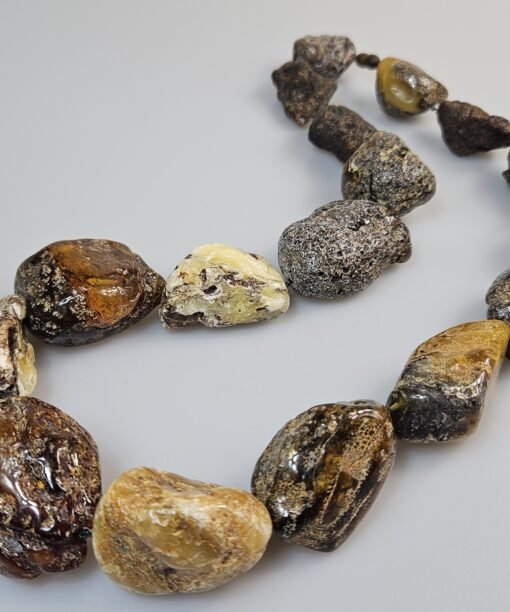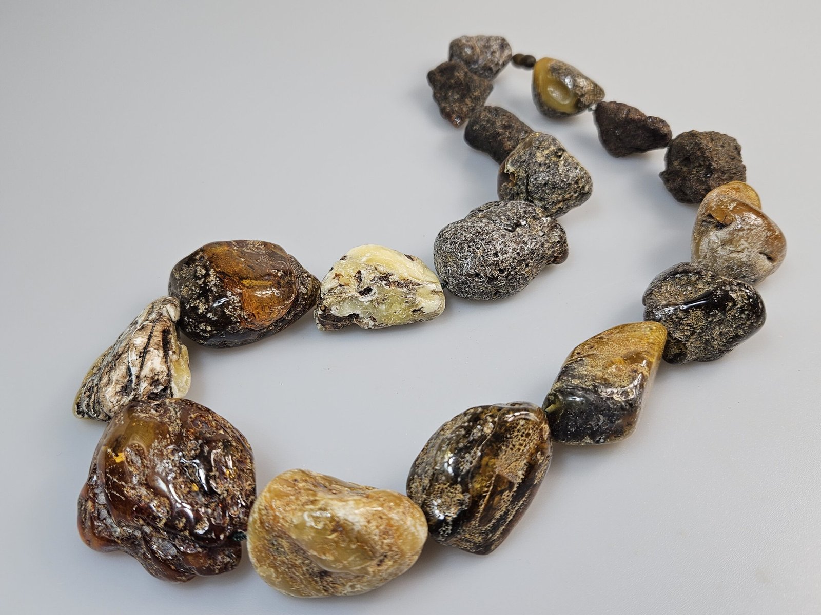Natūralaus gintaro karoliai. Poliruoti, tačiau ne šliuoti žalio ir gelsvo gintaro karoliai. Užsukami. Gydomųjų savybių turintis papuošalas. Užsukami. Gydomieji nešlifuoti, poliruoti gintariniai karoliai. Natūralus gintaras. Rankų darbas. Tik poliruoti. Ilgis 73 cm, svoris 247 gr akmenų dydis 3-4-5 cm