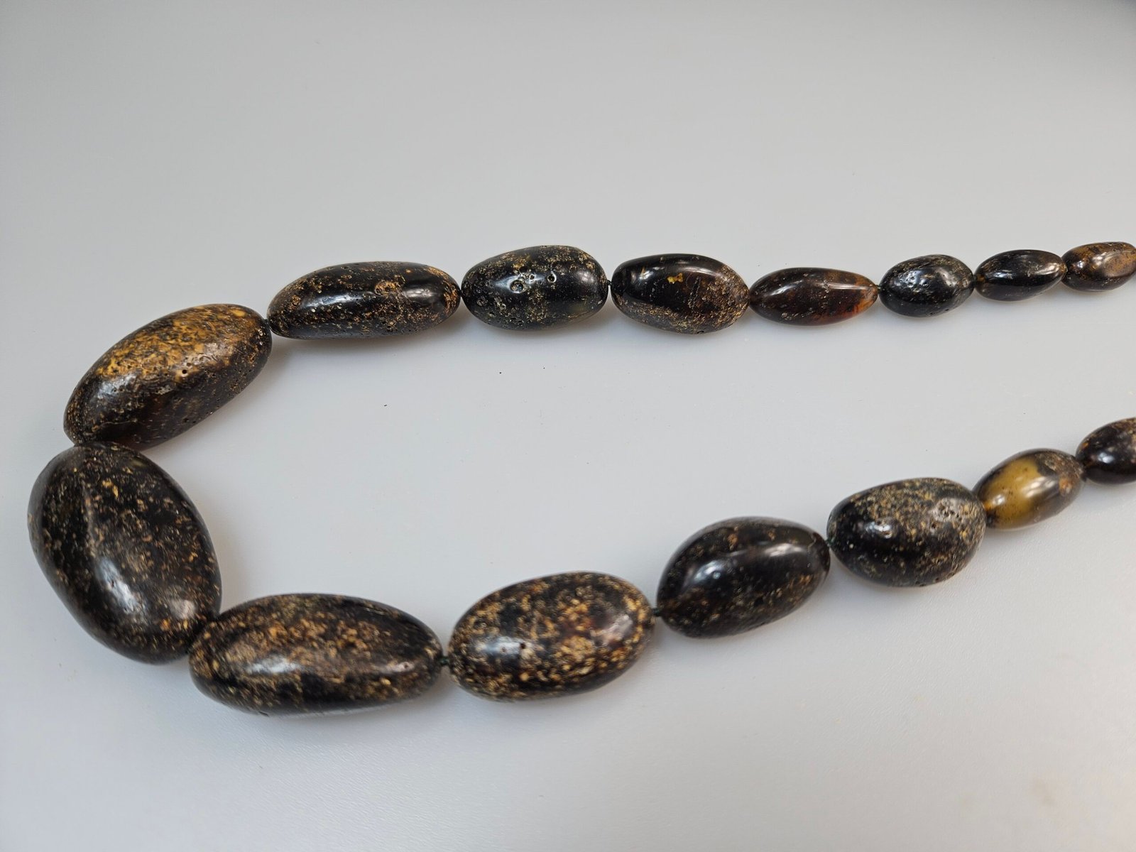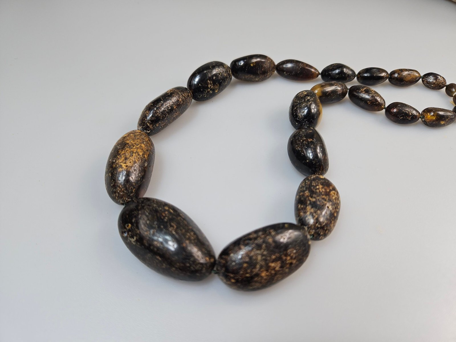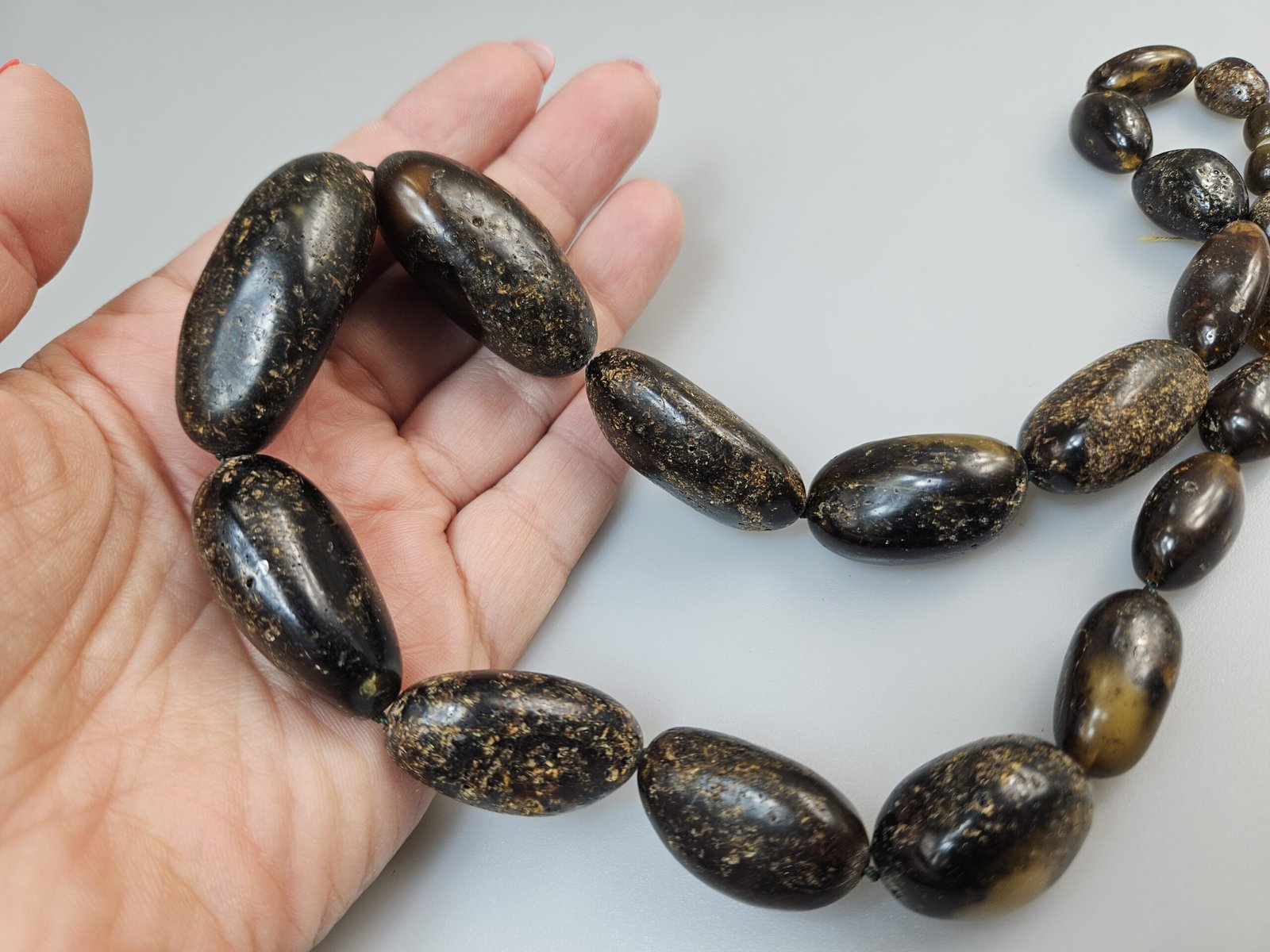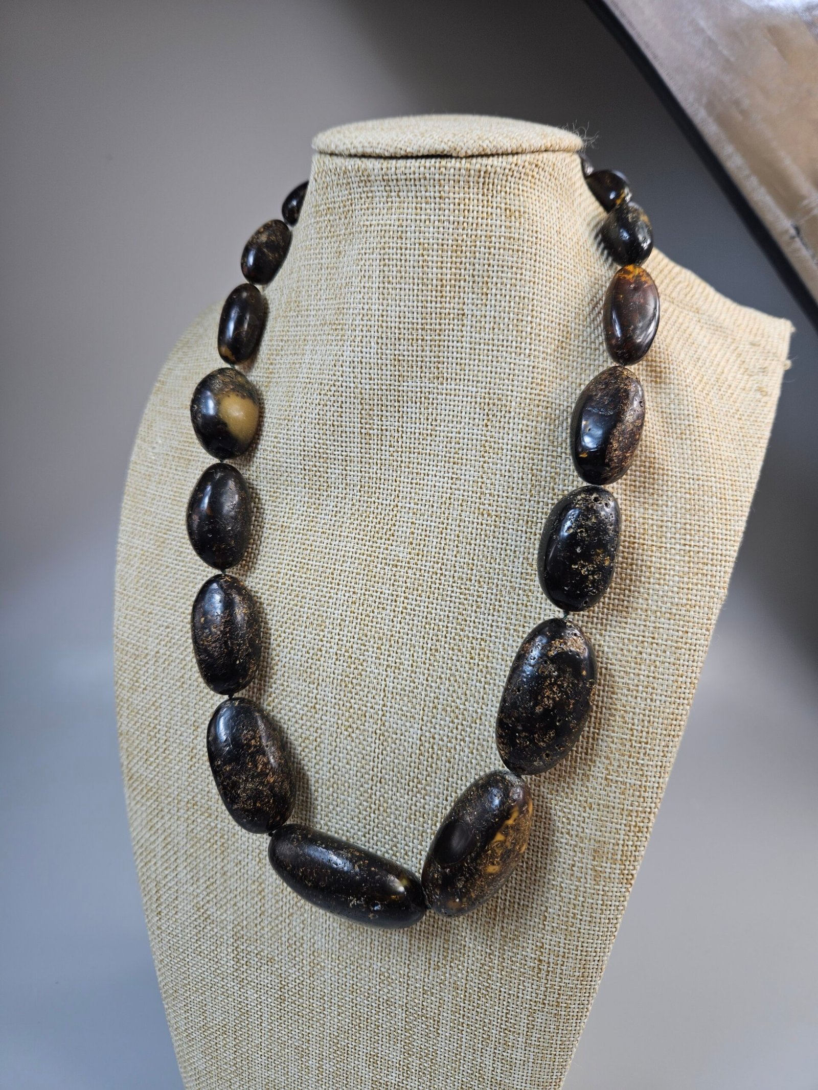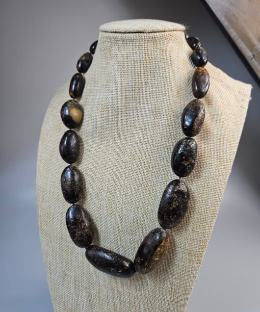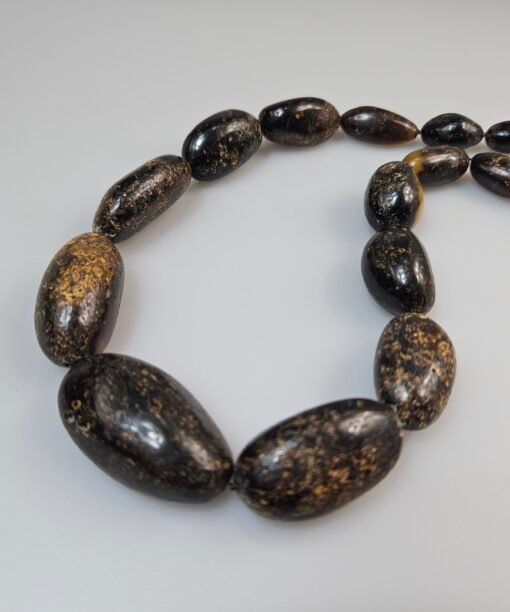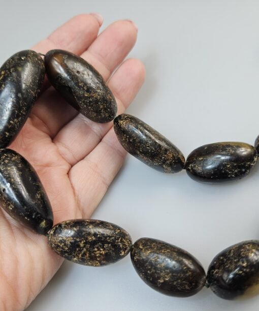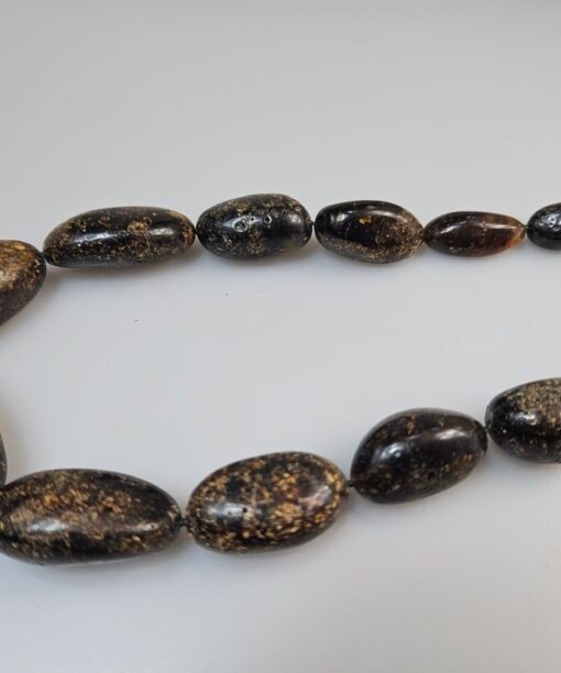 Žalio gintaro karoliai. Ilgis 54 cm. Svoris 73 gr. Masyvoki, bet labai grąžūs. Poliruoti akmenys apie 4-2 cm.