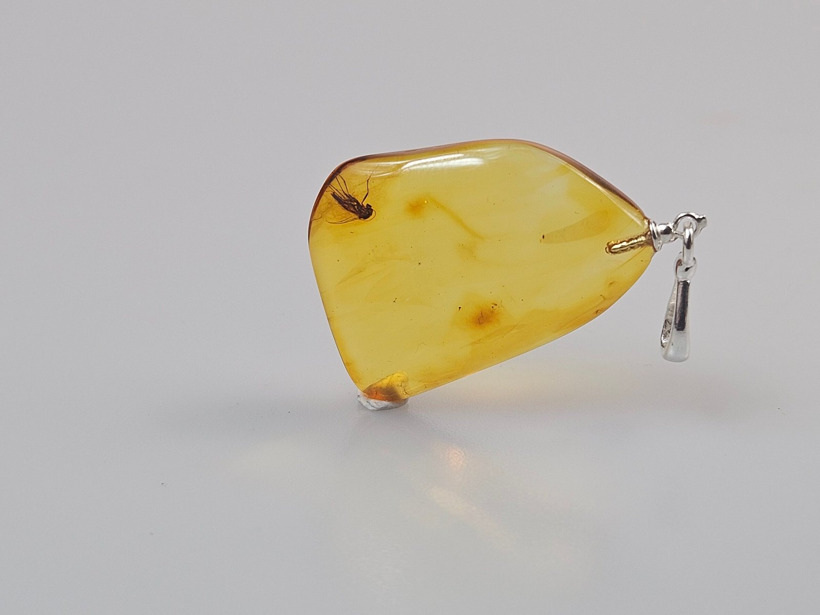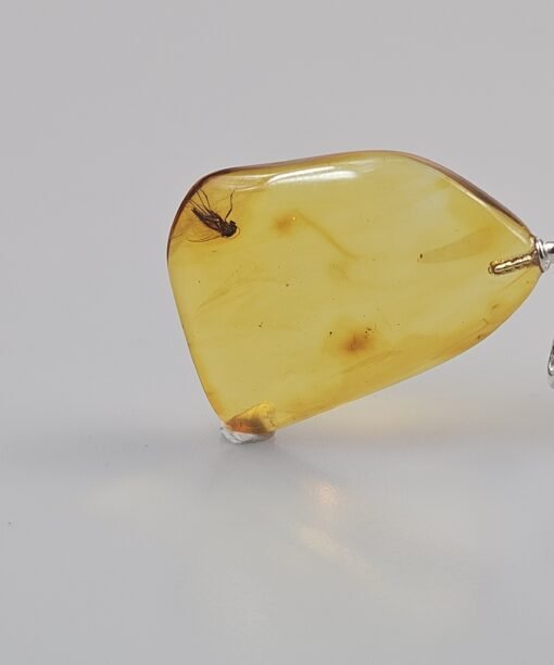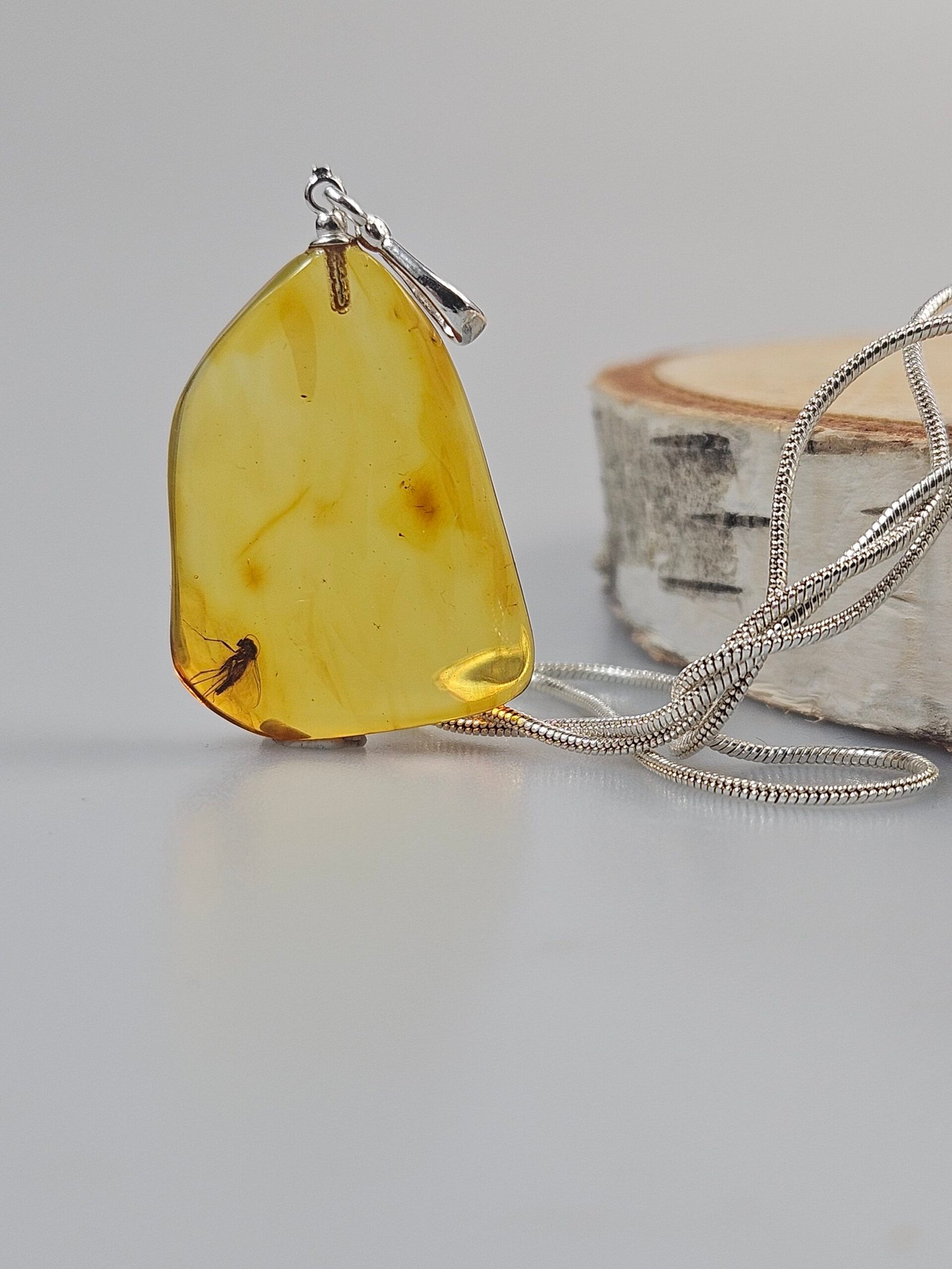 Pakabukas su inkliuzu. Mažas apie 2 cm ilgio. Su grandinėle – dovana. Apvalus gintarinis pakabukas su inkliūzu