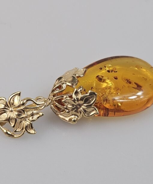 Auskarai su gintaru paauksuota saulė žali