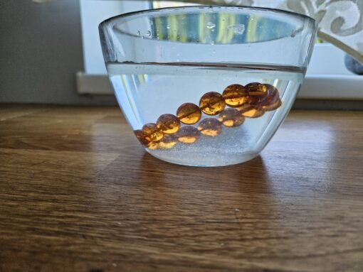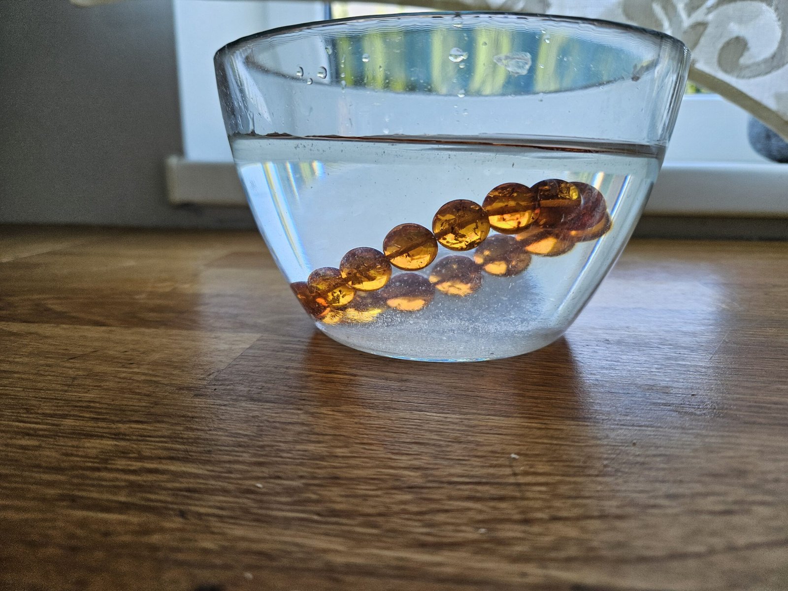 Instructions for use (simplified) and handling, storage, cleaning: Do not clean the products yourself as you may damage the amber. Contact a local jeweler.