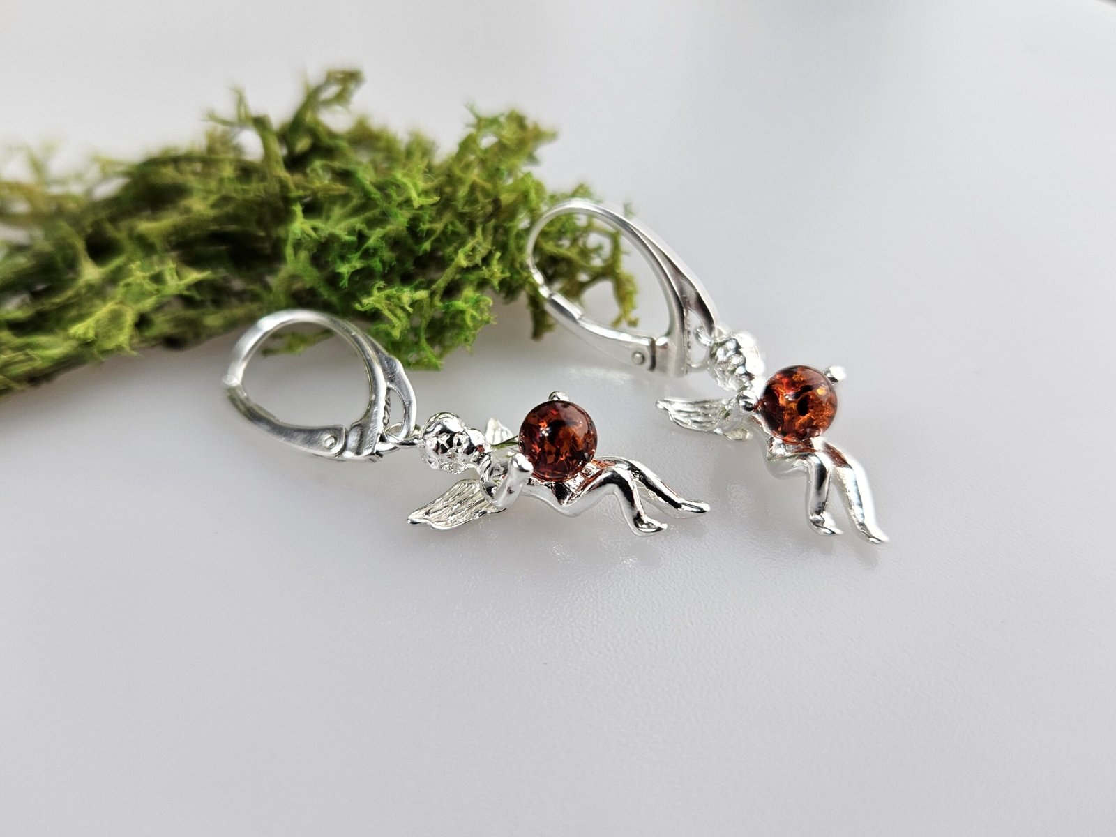 Silver earrings with amber – Angel christening gift Sidabras 925- visos dalys. 3,6 cm length