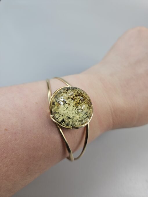 Auksinė žalio gintaro apyrankė. Unikali ir labai graži rankų darbo apyrankė. Reguliuojamas dydis.