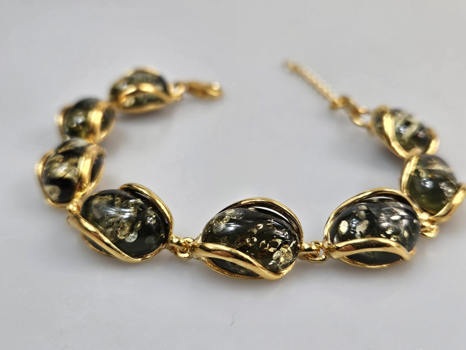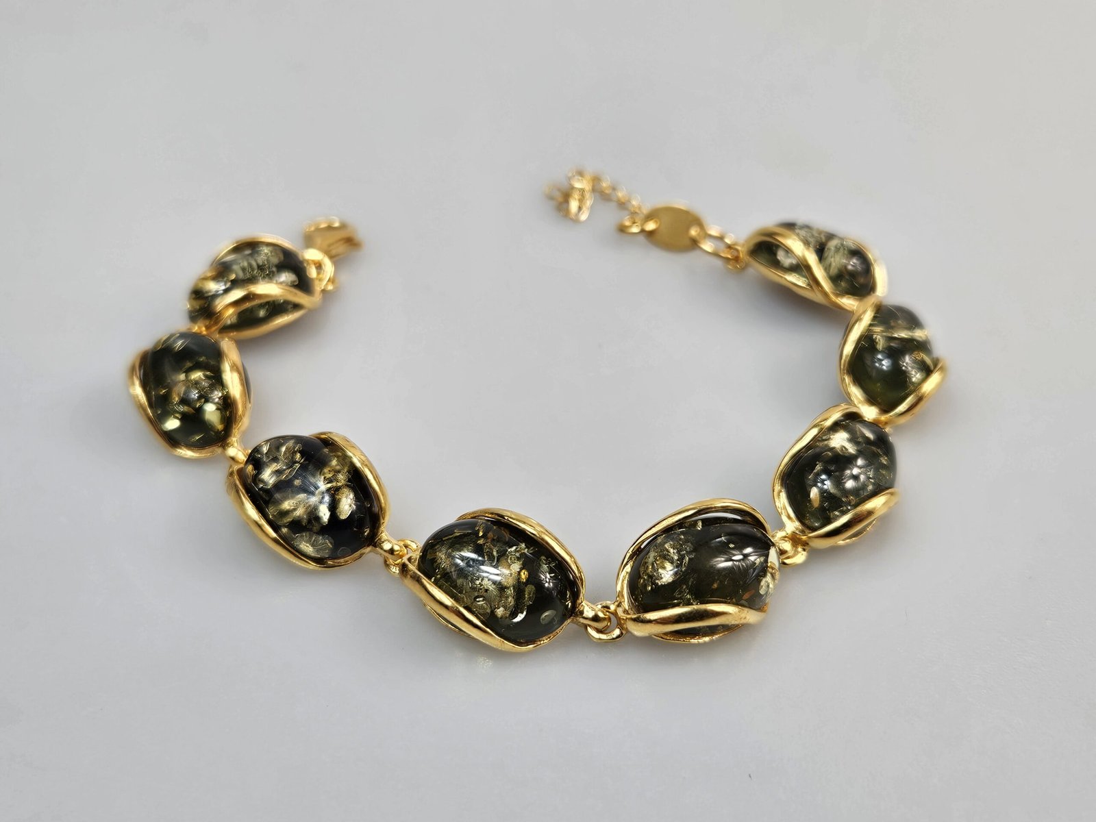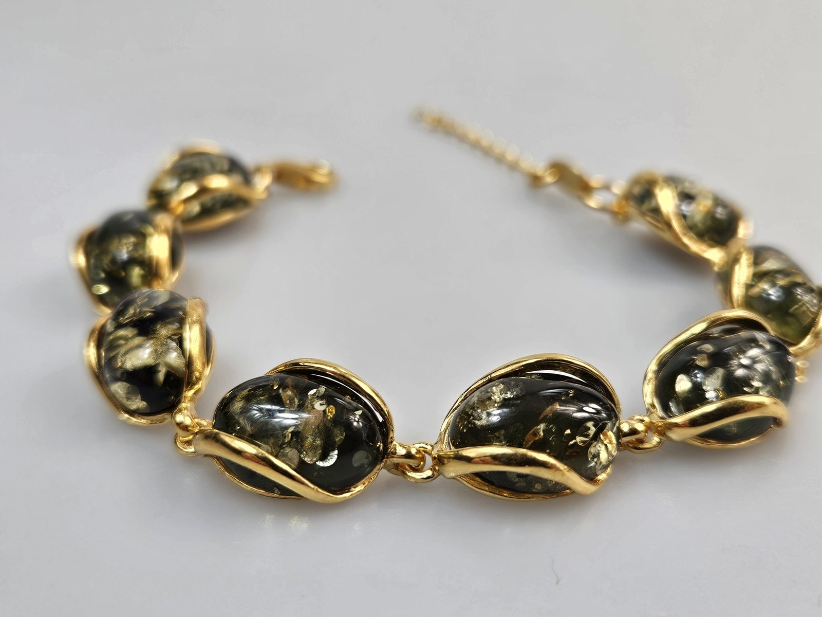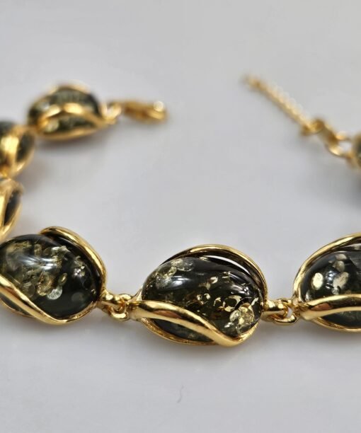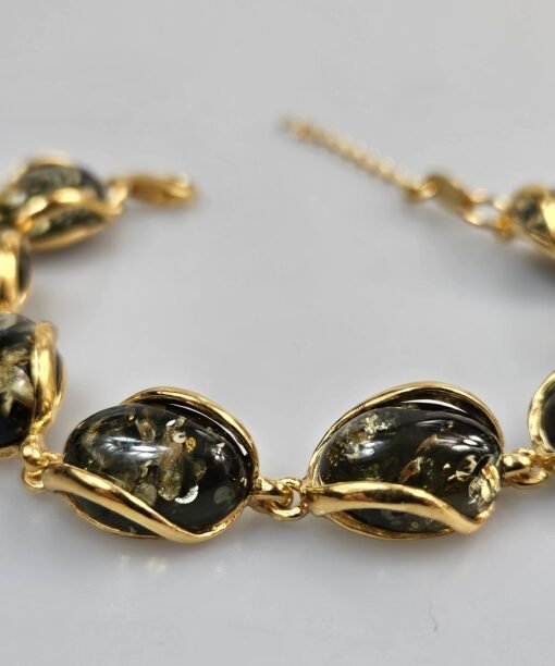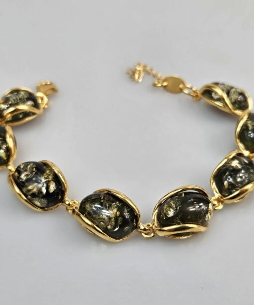 Paauksuotas sidabras 925. Prabuota. Reguliuojamas grandinėle ilgis. Žalias gintaras gintarinė paauksuoto sidabro apyrankė