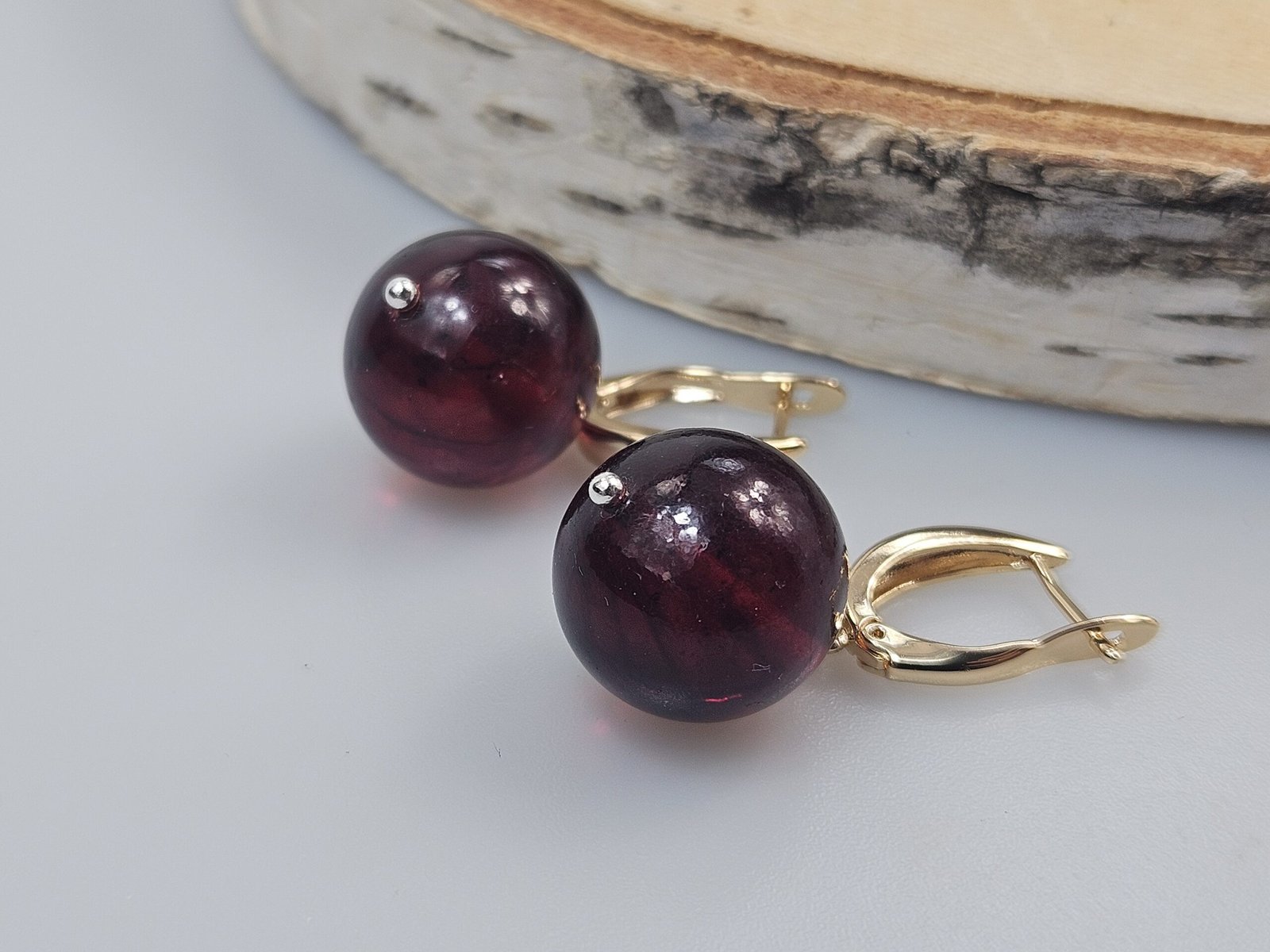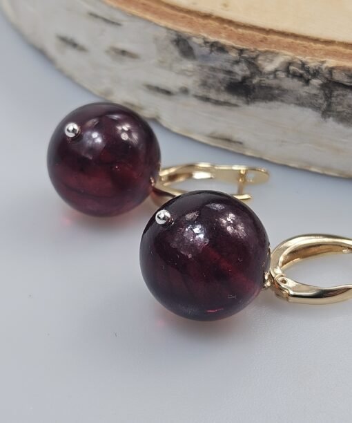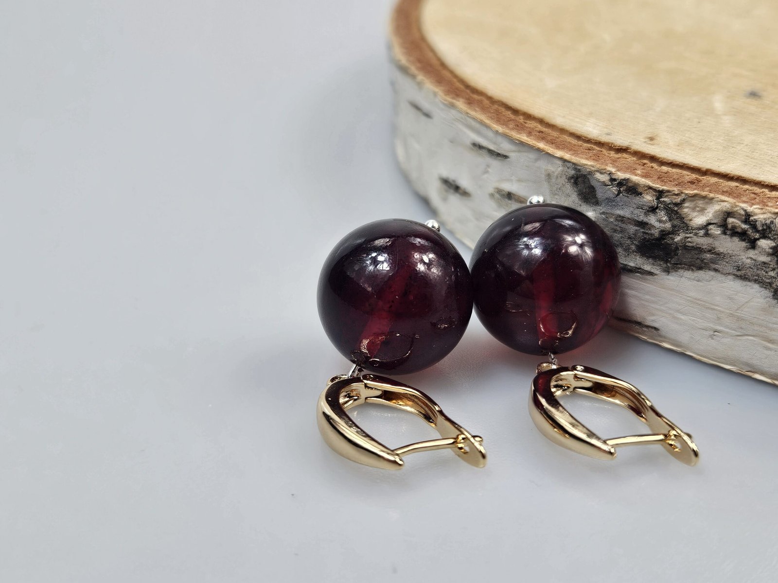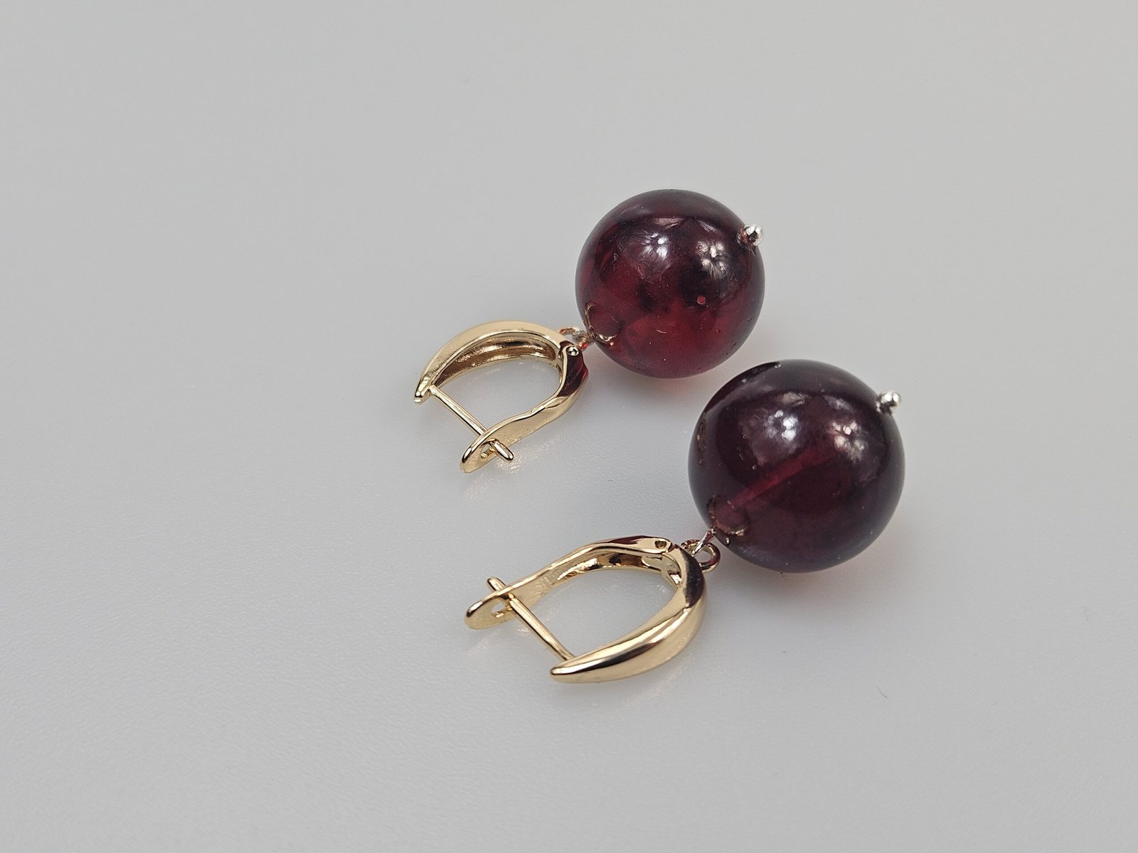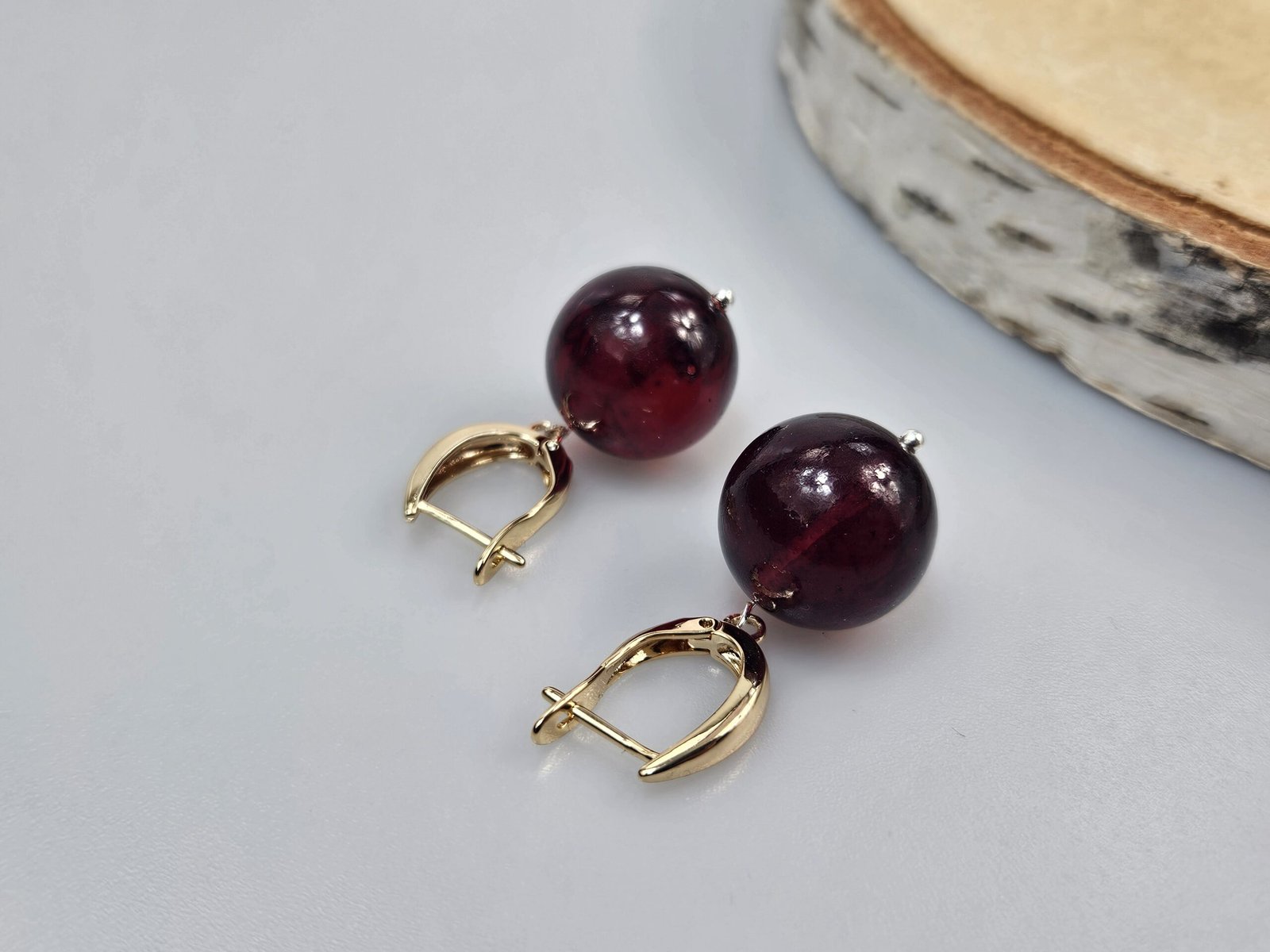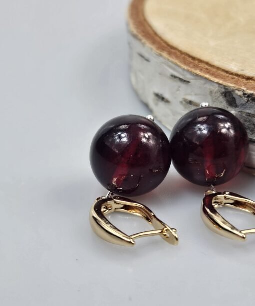 Raudoni paauksuoti auskarai. Kaitintas gintaras. Apimtis apie 1,3 cm. Apvalūs raudono gintaro auskarai. ilgis apie 3 cm.