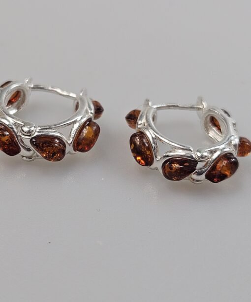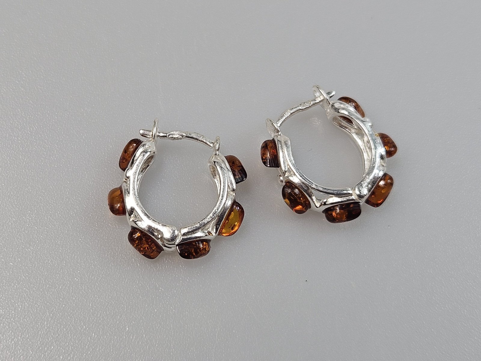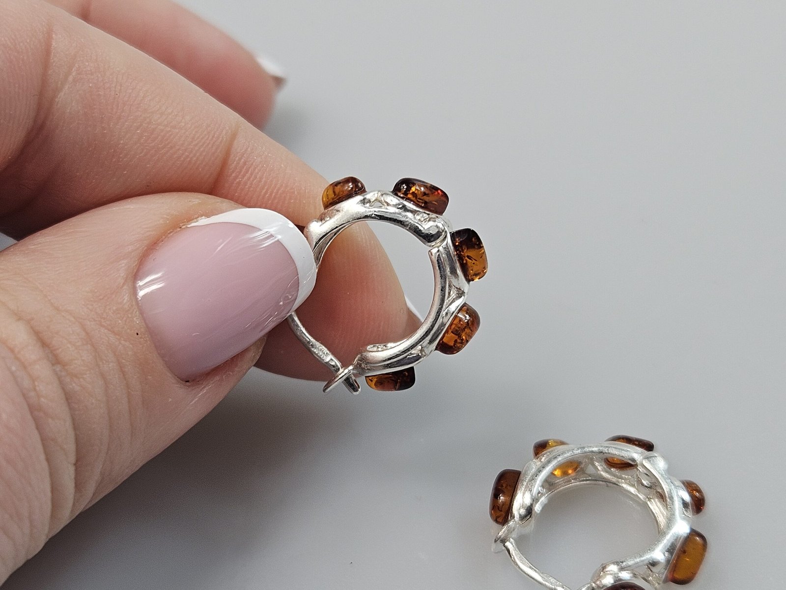 Sidabriniai gintaro auskarai . Visos dalys – Sidabras 925. Pagaminti iš natūralaus Baltijos gintaro. Ilgis apie 1,8 cm. Sidabriniai gintaro auskarai „Žiedeliai”. Sidabriniai gintaro auskarai su rudu gintaru.