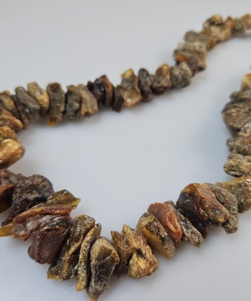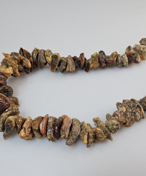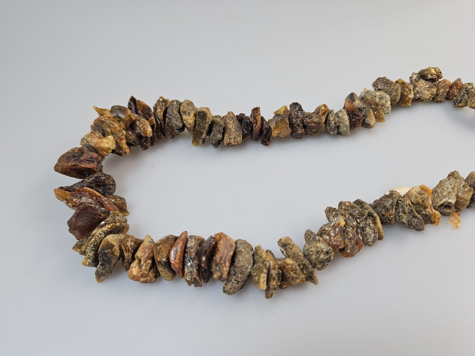 Neapdirbto gintaro karoliai. Ilgis 52 cm. Svoris 65,9 gr. gintarų dydis apie 1-1,5 cm. Užsukamas užsegimas.