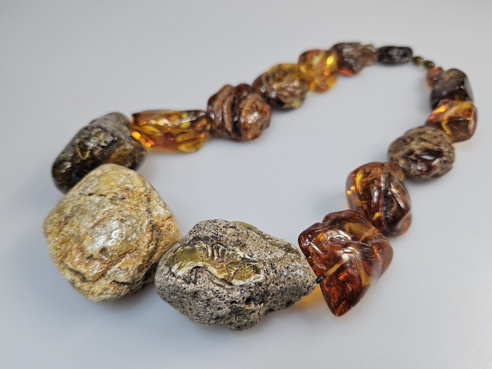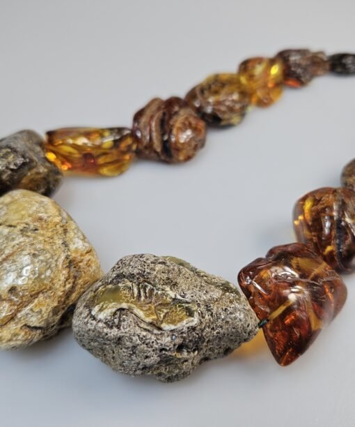 Rusvo ir žalsvo gintaro karoliai Gintariniai karoliai. 182 g. 59 cm. Aknenys 3,5-4,5 cm dydžio. Natūralūs, ne šlifuoti, tik poliruoti. Masyvūs įspūdingi.