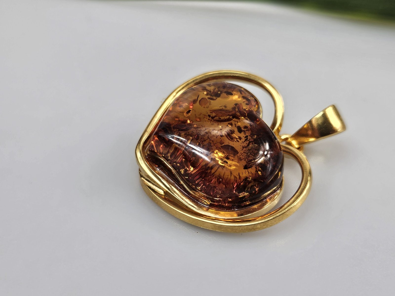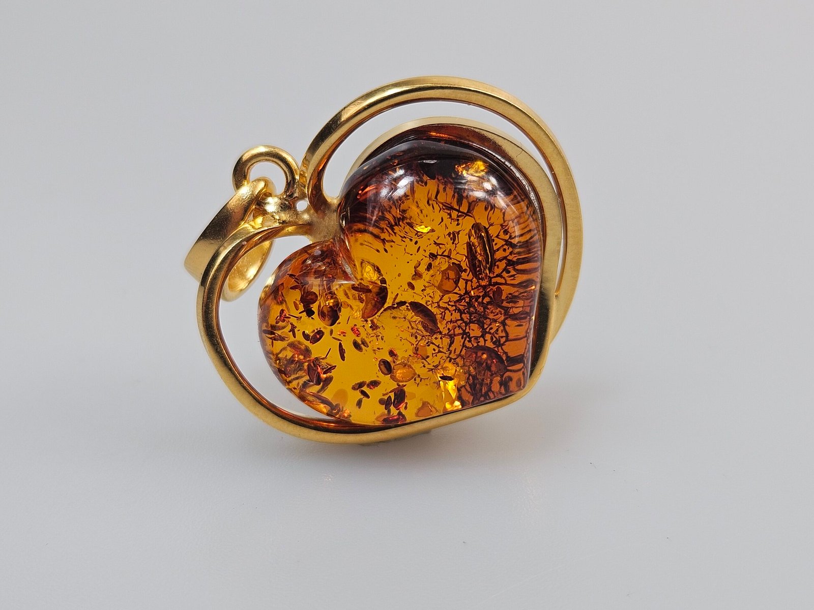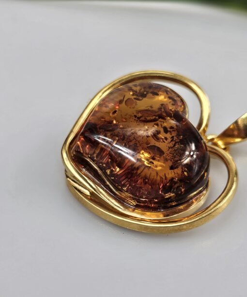 Gintaro pakabukas auksinė širdis. Ilgis 3,5x3cm. Svoris 9,84 g. Auksuotas sidabras 925.