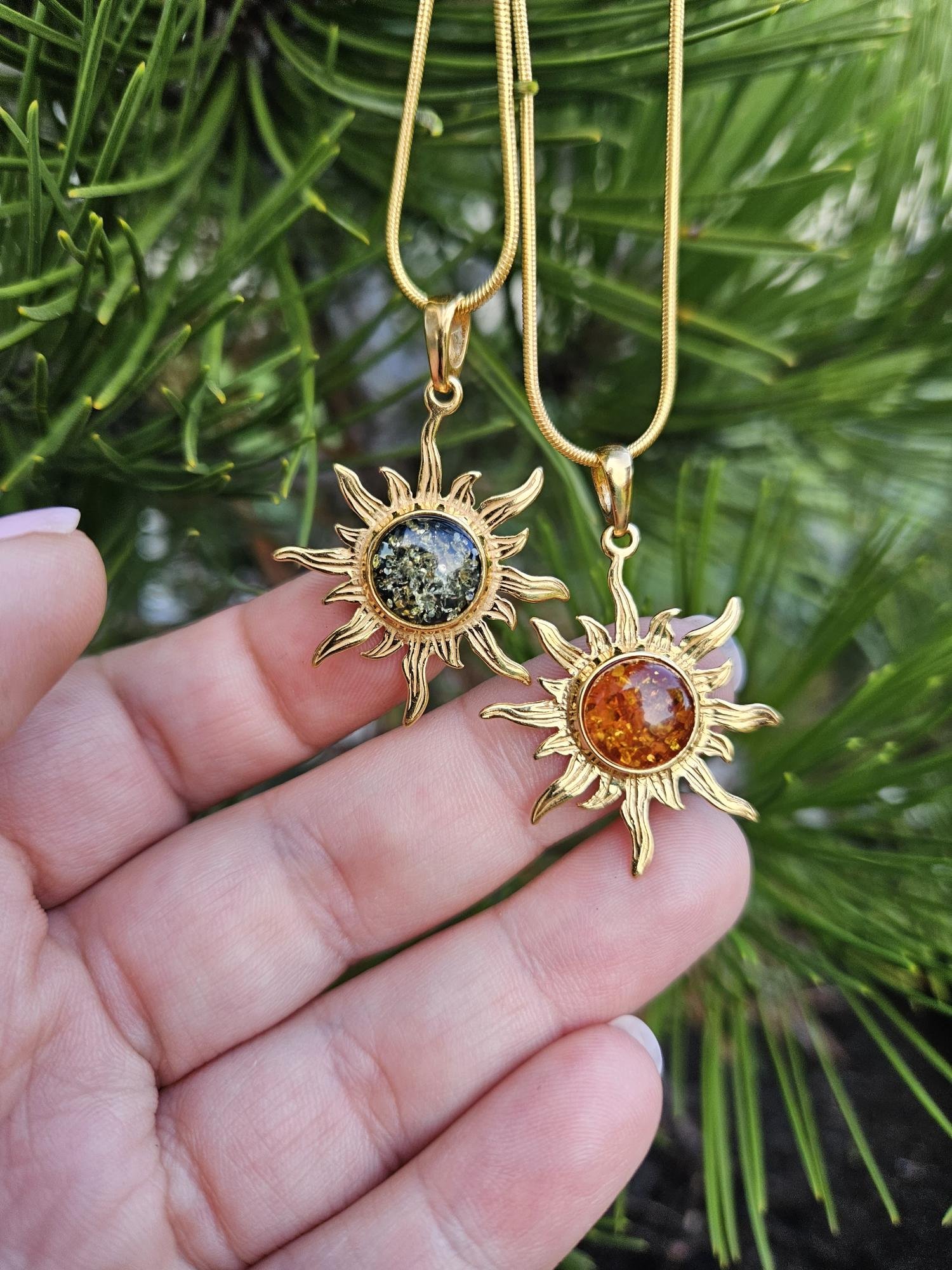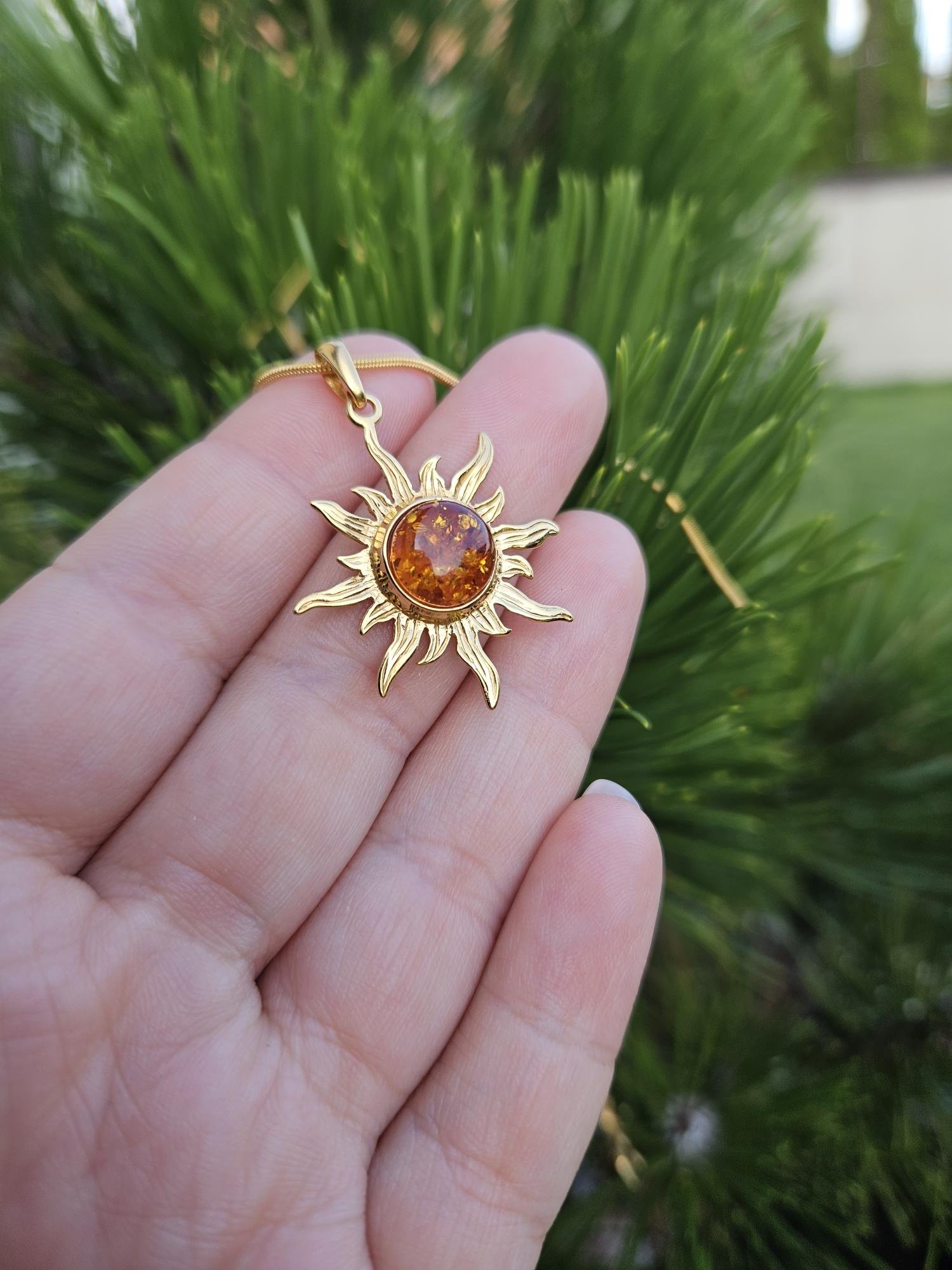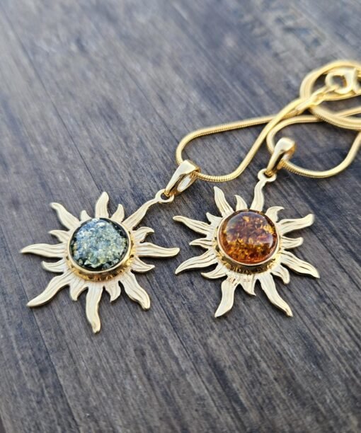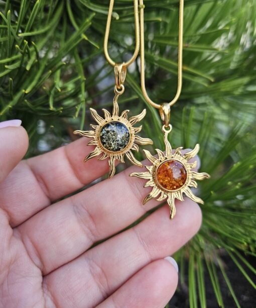 Rudo gintaro pakabukas su auksu Saulytė. Baltijos gintaras. Rankų darbo papuošalas.