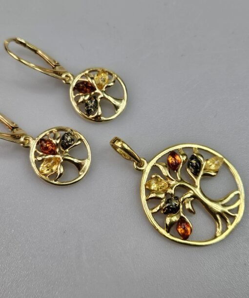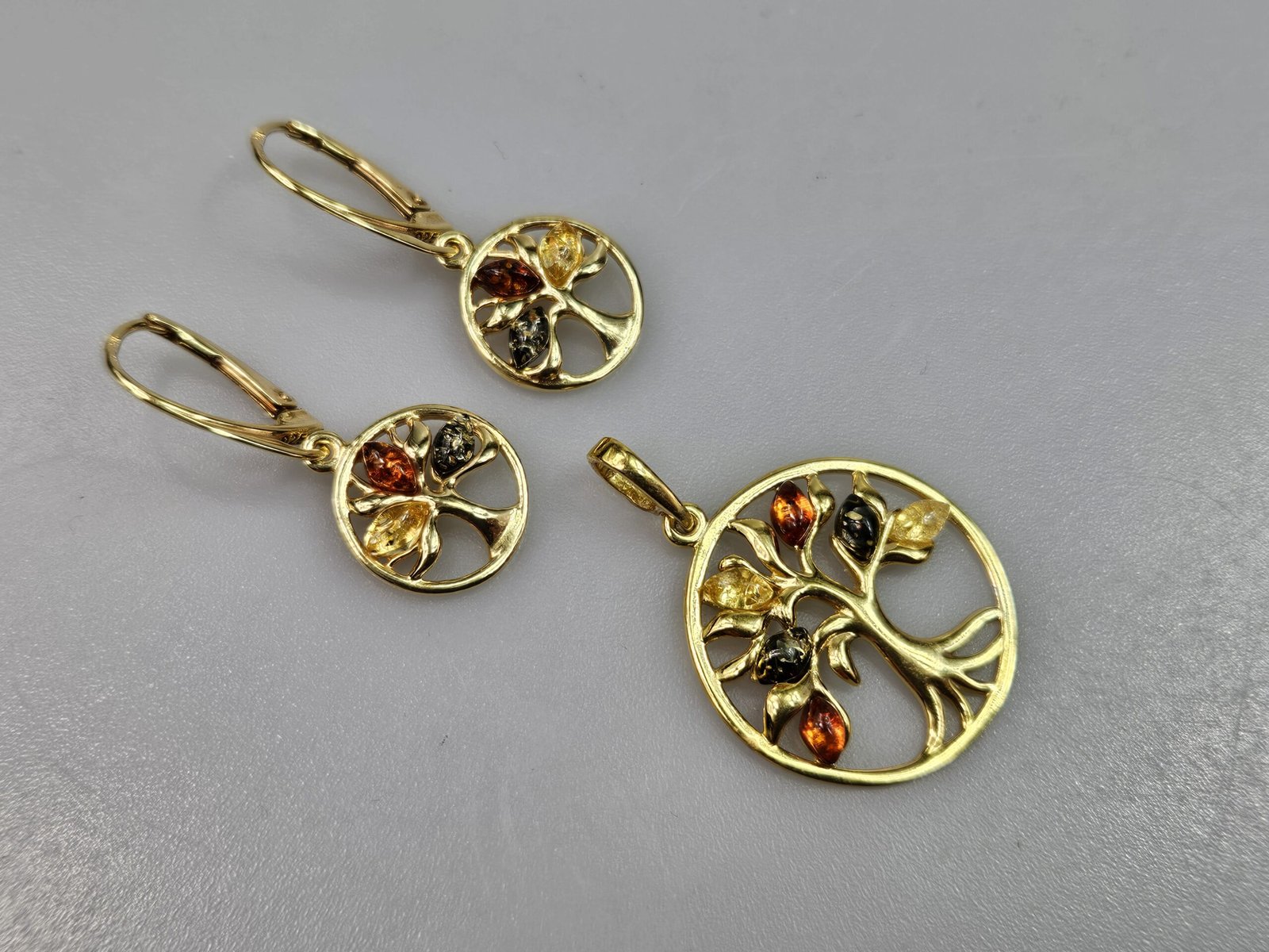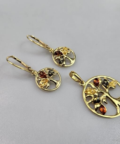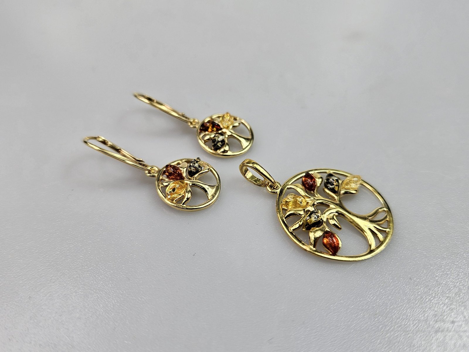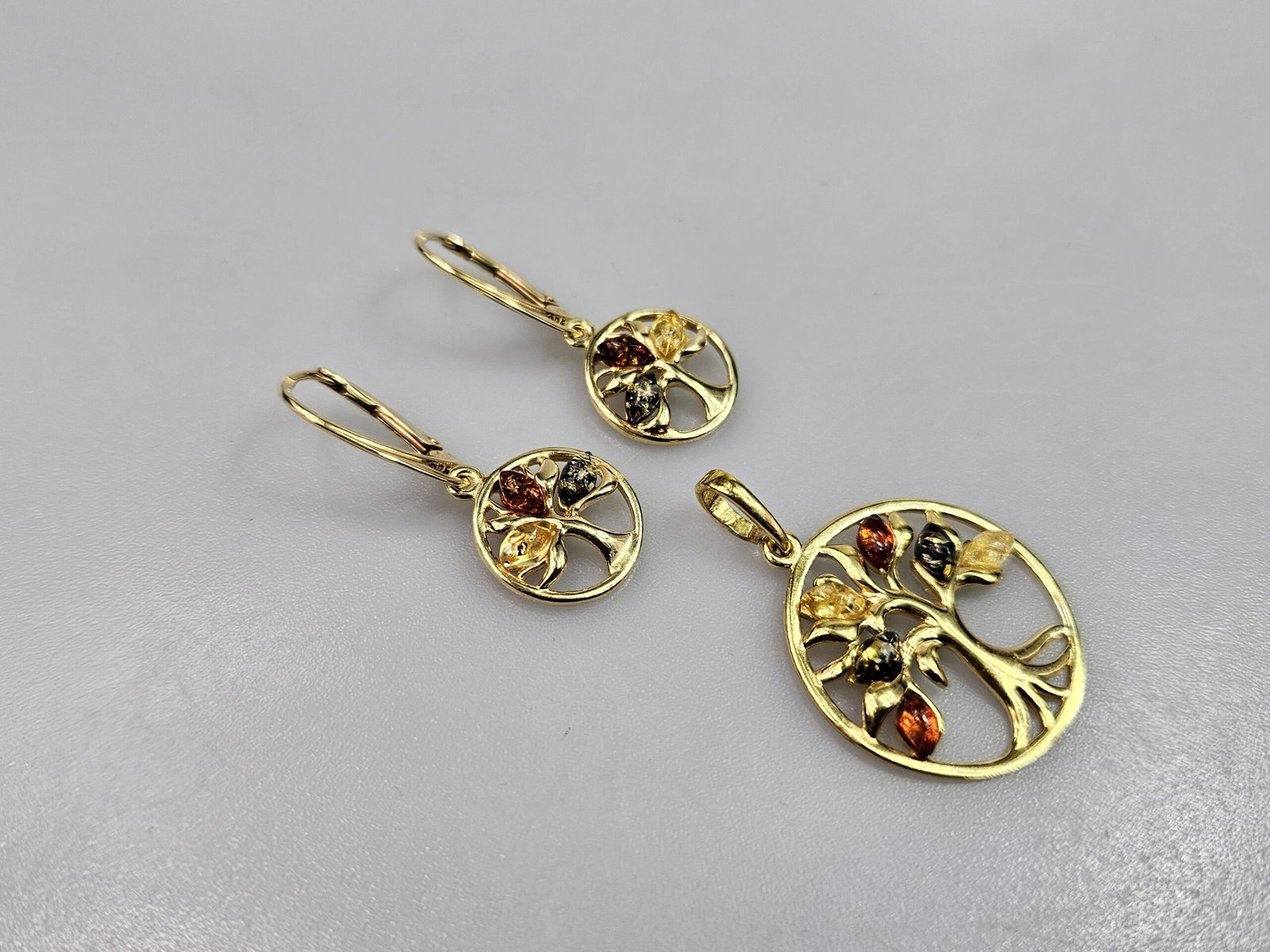 Paauksuoti gintaro auskarai ir gintaro pakabukas. Visos dalys – auksuotas Sidabras 925. Pagaminti iš natūralaus Baltijos gintaro. Auskarų ilgis apie 3,2 cm. Dovanų pridėsime grandinėlę – sidabruotas metalas.