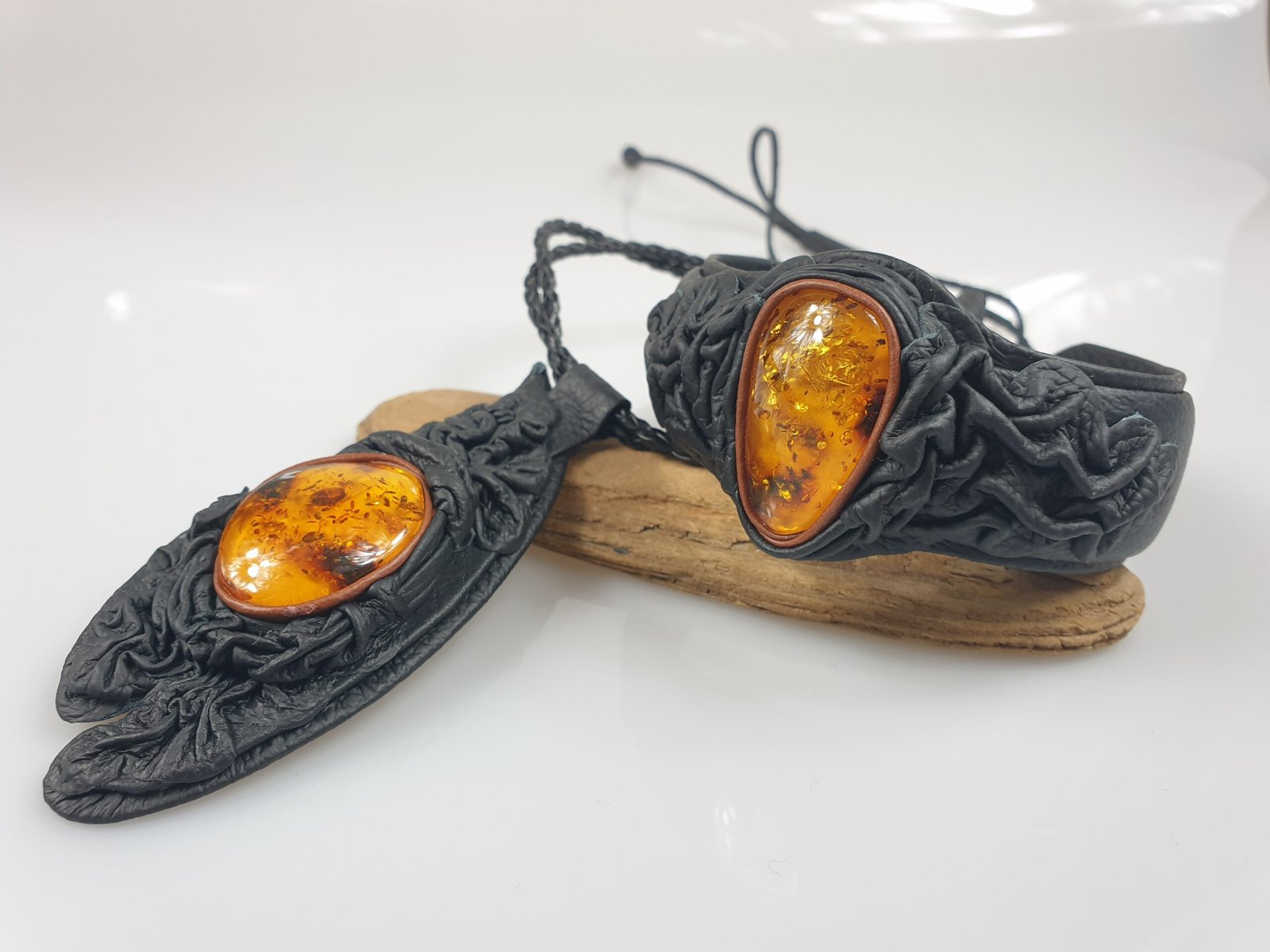 Juodos odos rinkinys su gintaru. Komplete reguliuojamo ilgio pakabukas bei reguliuojamos apimties apyrankė. Tikra oda ir tikras Baltijos gintaras. Dėmesio: kiekvienas rinkinys turi kito atspalvio gintarus, todėl Jūsų prekė gali ne ženkliai skirtis nuo matomos nuotraukose.