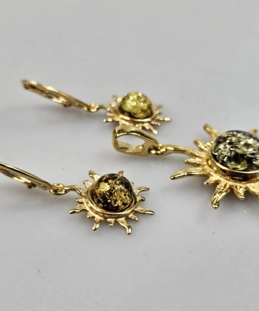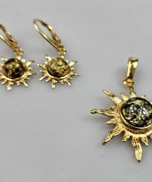 Paauksuoti gintaro auskarai ir gintaro pakabukas. Visos dalys – auksuotas Sidabras 925. Pagaminti iš natūralaus Baltijos gintaro. Auskarų ilgis apie 3,2 cm. Dovanų pridėsime grandinėlę – sidabruotas metalas. Žalio gintaro auskarai ir pakabukas Saulytės