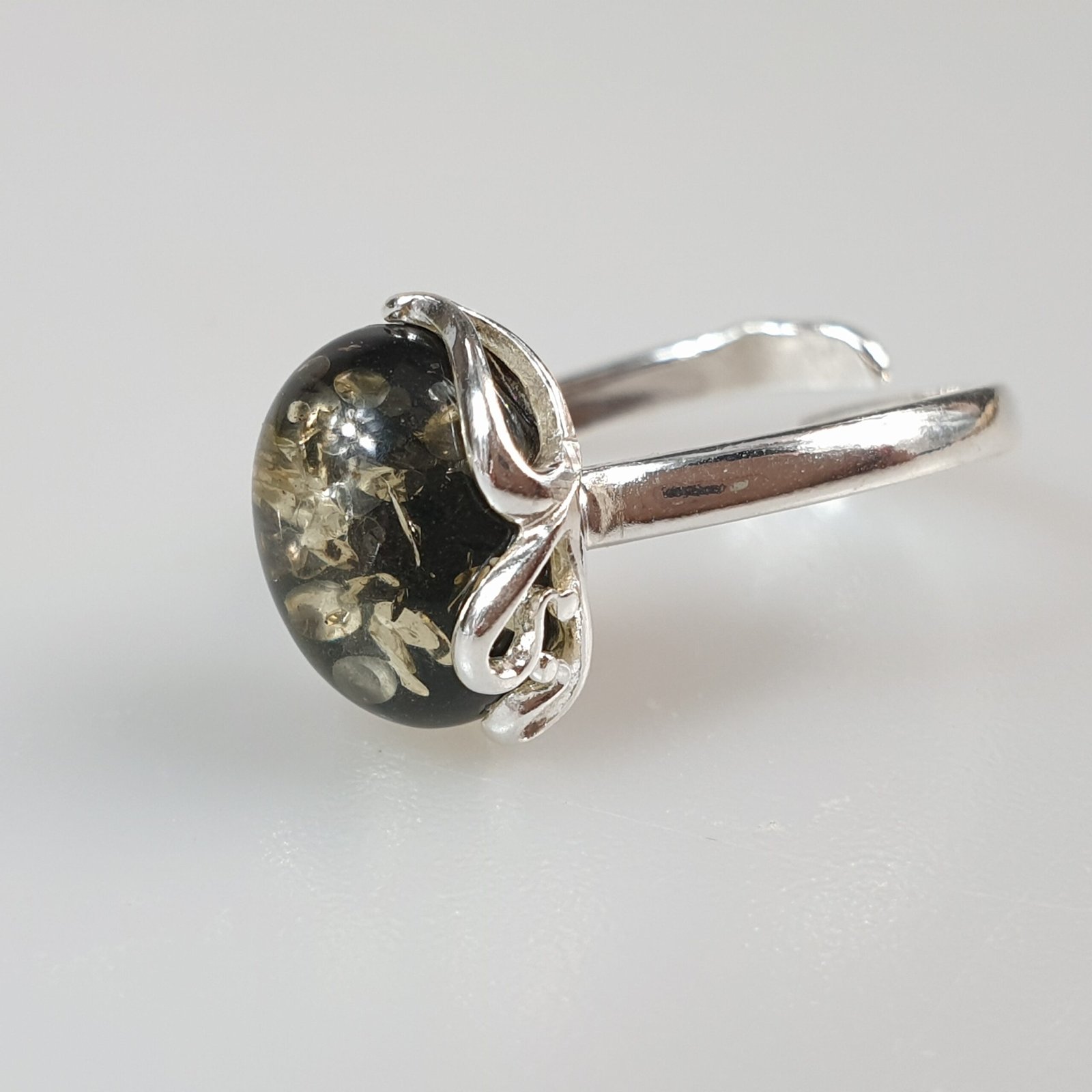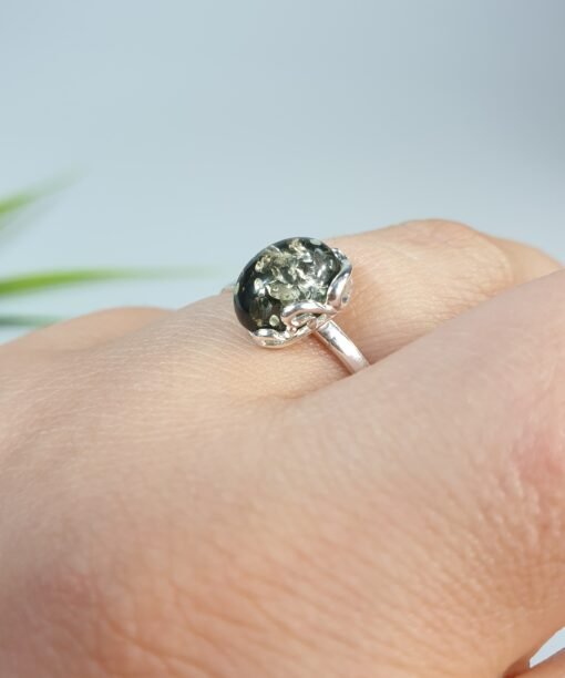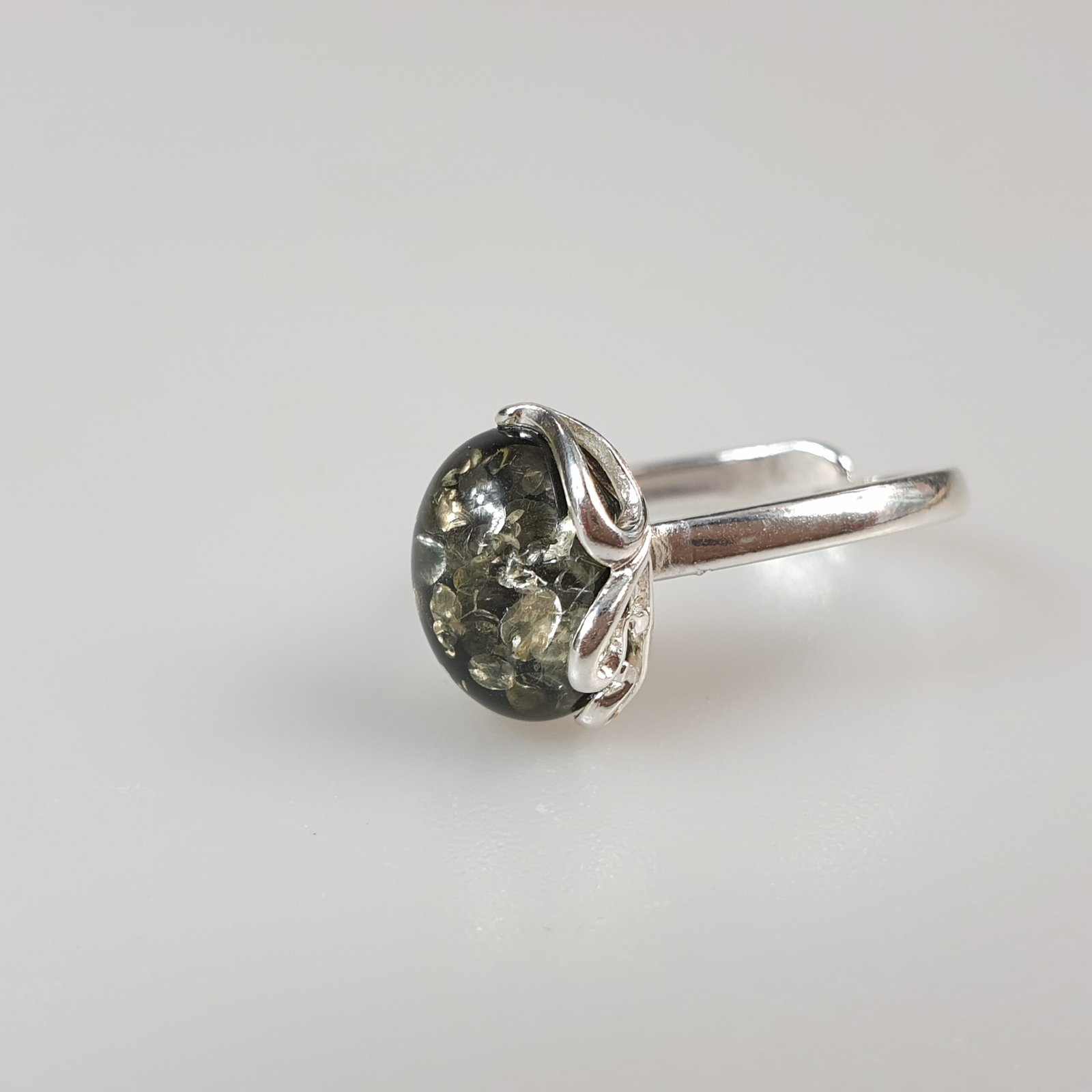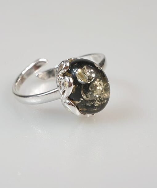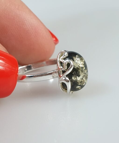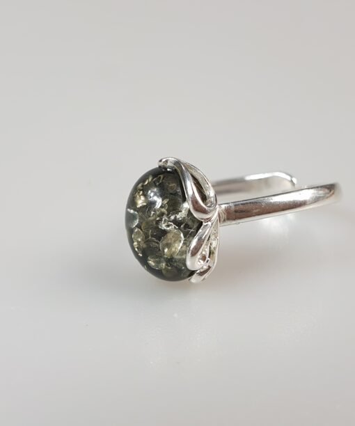 Sidabrinis žiedas su žaliu gintaru. Reguliuojamas dydis tiks įvairiems pirštams. Sidabras 925 su prabomis. Labai dailus ir mažas. Mažas žalio gintaro žiedas
