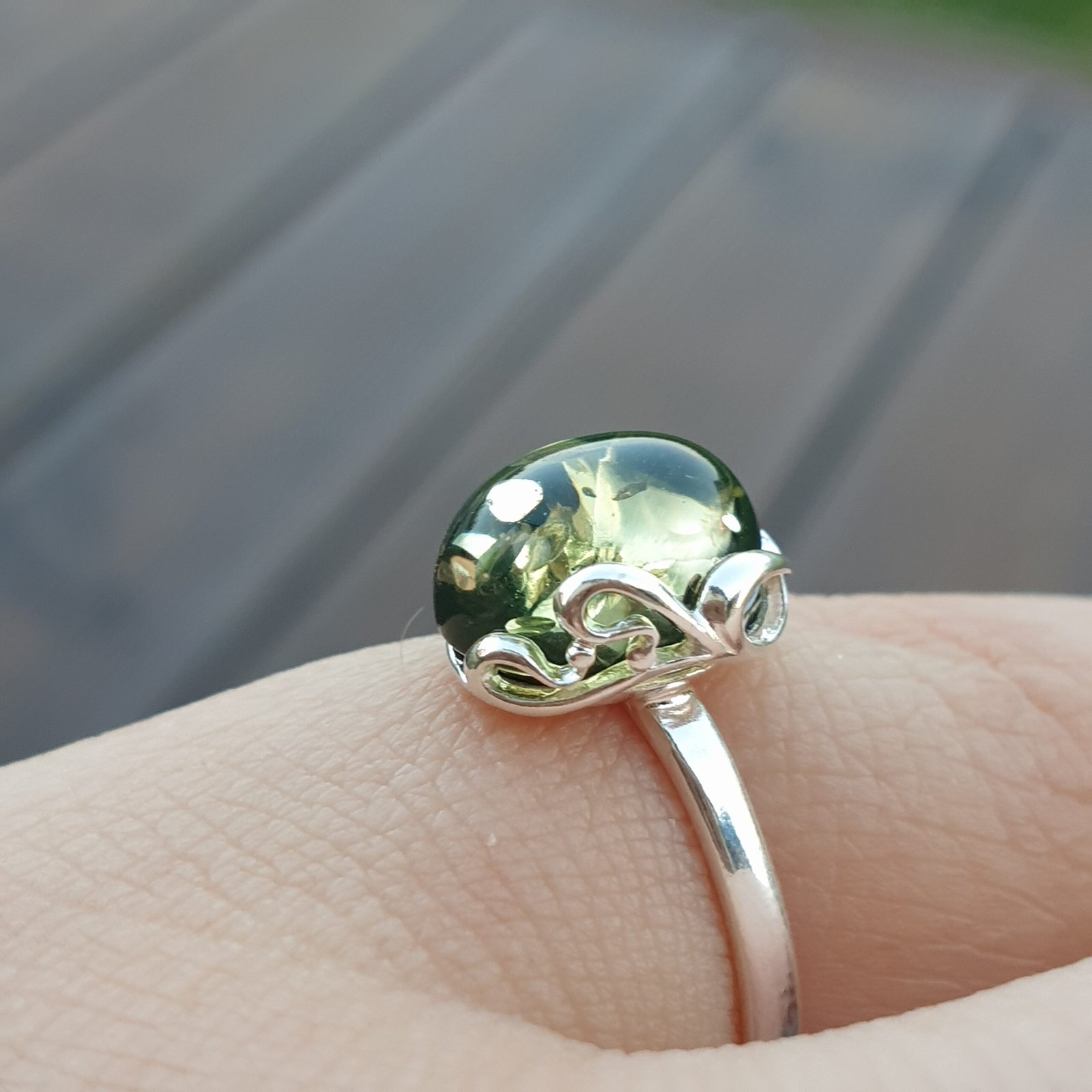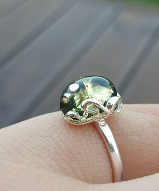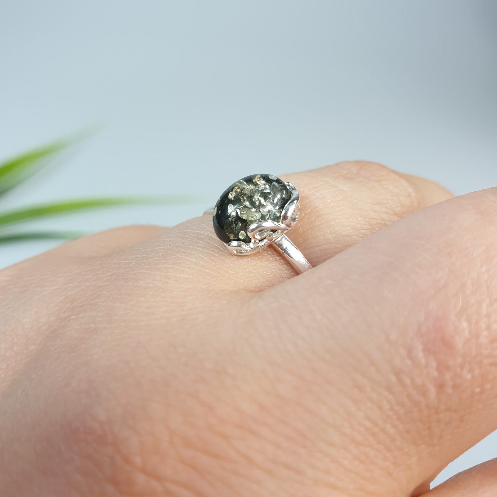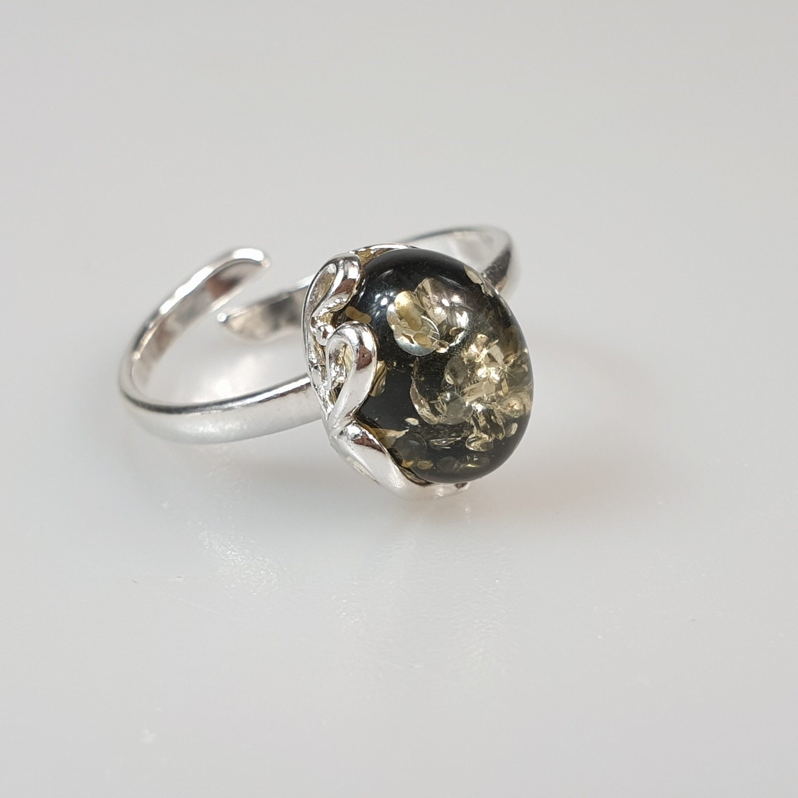 Sidabrinis žiedas su žaliu gintaru. Reguliuojamas dydis tiks įvairiems pirštams. Sidabras 925 su prabomis. Labai dailus ir mažas. Mažas žalio gintaro žiedas