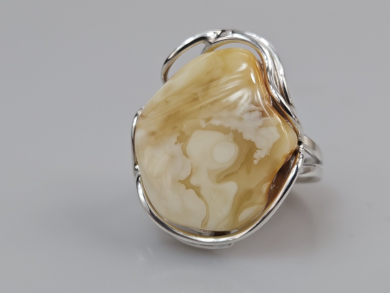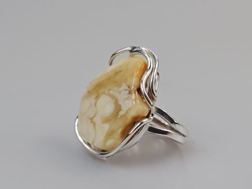 Neapdirbto gintaro sidabrinis žiedas. Akmens dydis 3×2 cm. Reguliuojamas dydis. Praba 925. Metalas: sidabras.